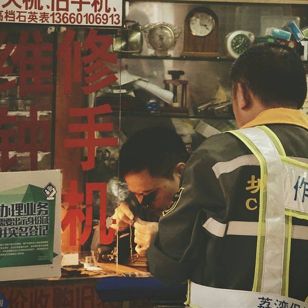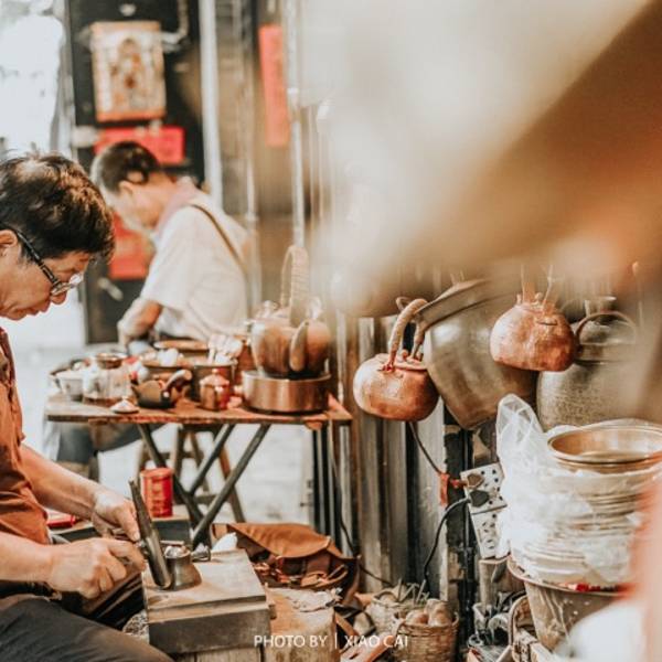 在旁边呆了一会,陆陆续续有一些人来店里拍照的,苏伯也没咋介意,只是依旧打着铜器,和边上的好友聊着天喝着茶,放佛已经习惯了游客的来来往往。