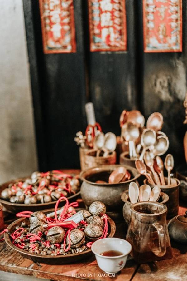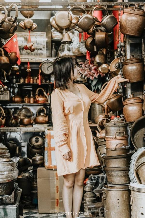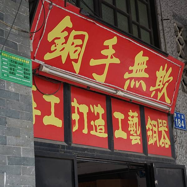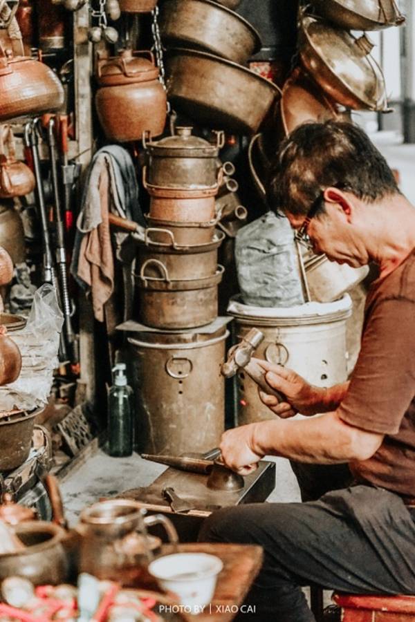 从恩宁路一路走来,不远处就能听到前方处传来的“铛、铛、铛......”的声音,格外清脆悦耳,走进一看原来是一家铜铺。小小的店面,堆放着铜锅铜盘铜壶铜碗等各色各样的铜器,有堆放着的,也有门口挂着的,种类繁多,远远看去金光闪闪特别有感觉。