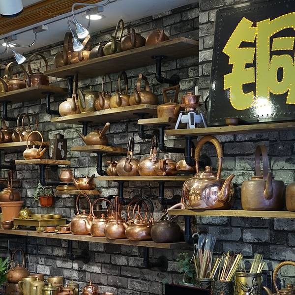 因为手打的不太好做大件物器,店里商铺以简单的日用餐具居多,碗盆杯子摆件勺子铃铛等,没有太多章序的放在一起,金光闪闪。单价从几十到几百不等,都是匠心之作。
