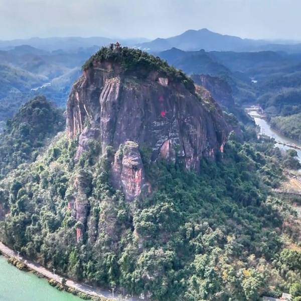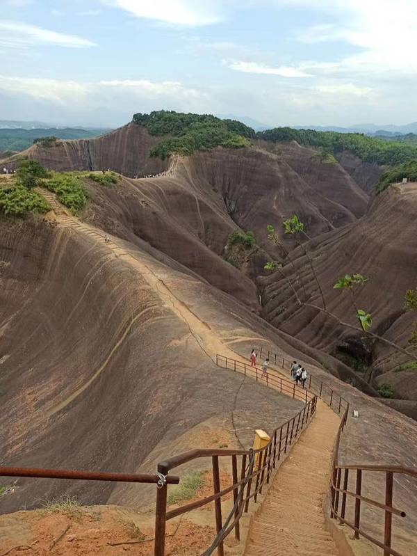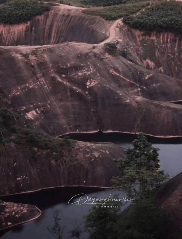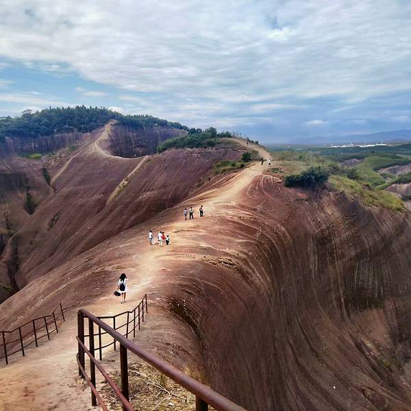 高椅岭是一块尚未开发的丹霞地貌处女地,有“小丹霞”之美誉。它最大的特点就是丹霞地貌周边有漂亮的水洼点缀,红岩绿水,非常吸睛。高椅岭四壁悬崖陡峭,岩脚陡坡辟有磴道,两旁也修有栏杆。建议穿抓地力强的登山鞋,坡道还是比较陡滑的。不过,你却难以用言语去描述它的美,只有切身实地站在山上才能感受到呈现的气势。站在高椅岭上,视野很开阔。远方的白雾如同围起一堵白墙,隔绝这个“世外桃源”。