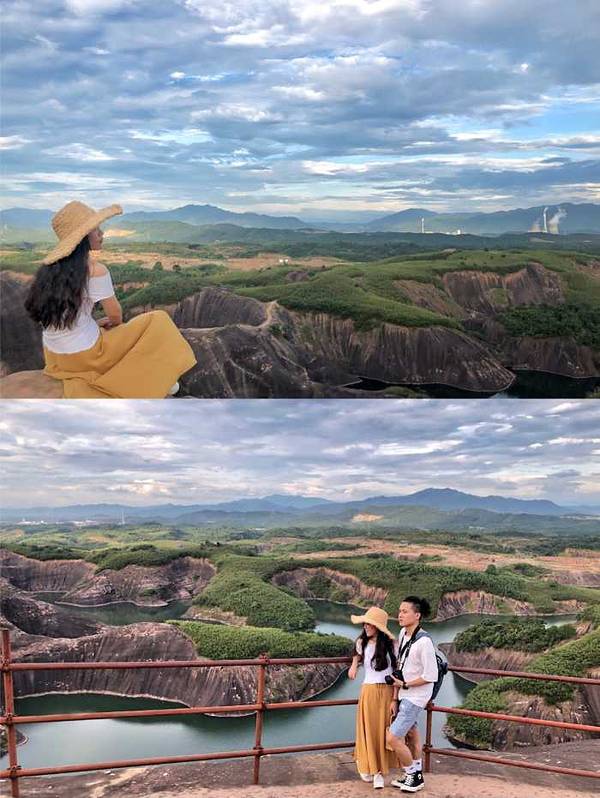 还有老鹰在湖上盘旋。我们只能远远望着那明镜般的湖水,映衬着近处灰黄的山,翠绿的山尖草木,远处黛色群山和灰白的雾,头顶瓦蓝的天与洁白的云,慨叹着,造物是多么的奇妙!有一些山包与山包之间是很窄的路,石头很光滑,四面都是悬崖,稍有不慎便会滑下去,得小心翼翼。刺激得很~高椅岭景区游玩时间两小时左右,司机便在山脚催促我们。