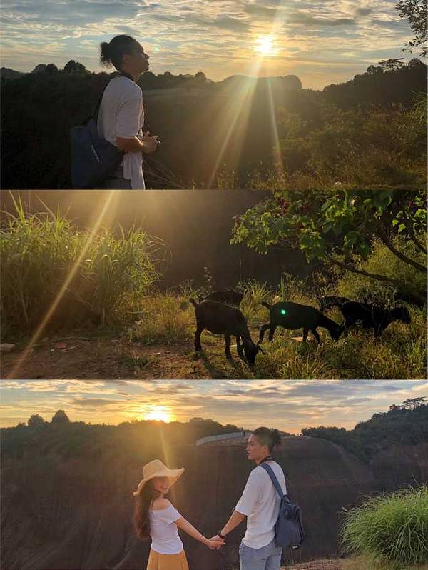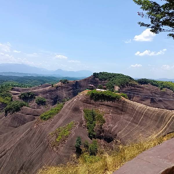 还没有看到美景的心情还是很期待很兴奋。上山路上有个马棚~下午两点,正是一天中最热的时候,而且高椅岭是丹霞地貌,一座一座的大石头山,基本只有石头顶上才有些树,而爬上顶之前一路光秃秃的甚至连草都没有。明明站的山不高,只能算是一个大石头的顶上,四周的山也同样的低矮。