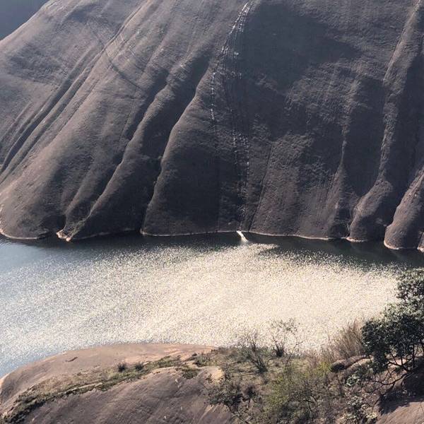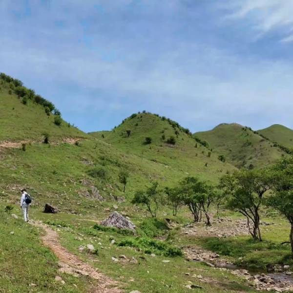 一座一座山包错落地排列着,山脚山腰都是光秃秃的灰黑暗黄色裸露的,只有山尖顶着一些树像绿色的寸头。但就是这许许多多的寸头组合,连接着触手可及的天空和视线尽头的地平线,进入开阔的视野,显得壮观!尽管景区不大,山也很低,但头顶烈日,脚下又是随时可能滑下去的光石头,还有点紧张。此处提醒,一定要穿鞋底齿轮大的防滑的适合登山的运动鞋。爬上第一座山头时,转身回望来时的路,然后举目四望,心情在一瞬间就燃烧起来。极目远眺~群山之间有一汪蓝绿色的湖,在深深的峡谷里。有试图下到石头山底下去触摸湖水的,都没能成功,因为光滑的石头山,越到底下就越陡峭似悬崖,根本无法下去。有一群黑山羊,还能在石山上奔跑,让人惊叹。