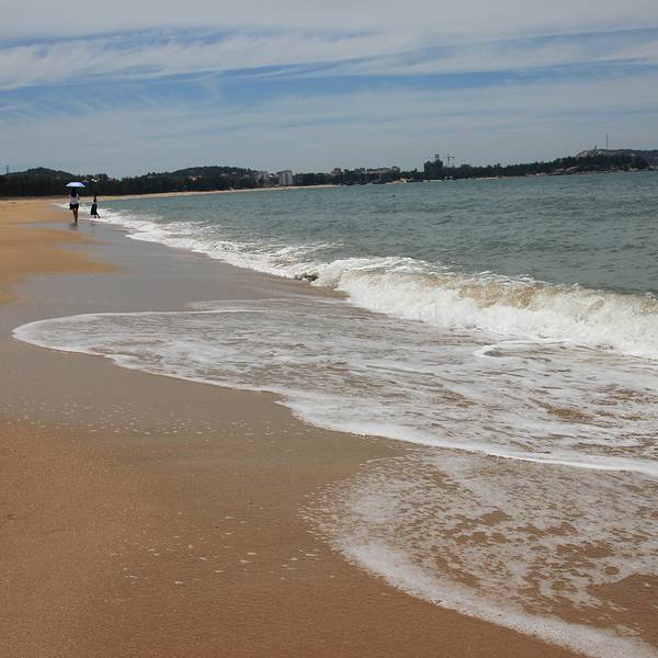 前临碧波万顷,后枕绿茵千畴。金色的沙滩绵延数公里,宽敞平坦,状如一钩新月,悬挂在湛蓝的大海上。
