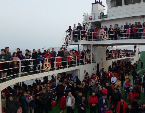 登船很快到达岛上,乘公交直奔黄金沙滩。天气很好,黄金沙滩爽心悦目,玩的痛快!只是要赶回程最后一班船,时间紧张,不到一小时结束。想再玩两个景点:莲池沙滩和妈祖祖庙。因做错公交车,用时很长步行找莲池沙滩,再到妈祖祖庙时觉得时间来不及,就没下公交车。到了码头刚一会就要上船,原来这最后一班船是货船。所有人等全部转移到远处货运码头,5:30开船回程。