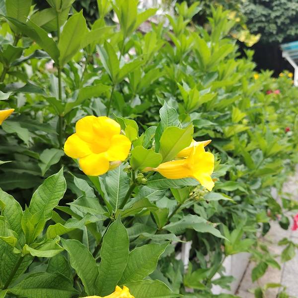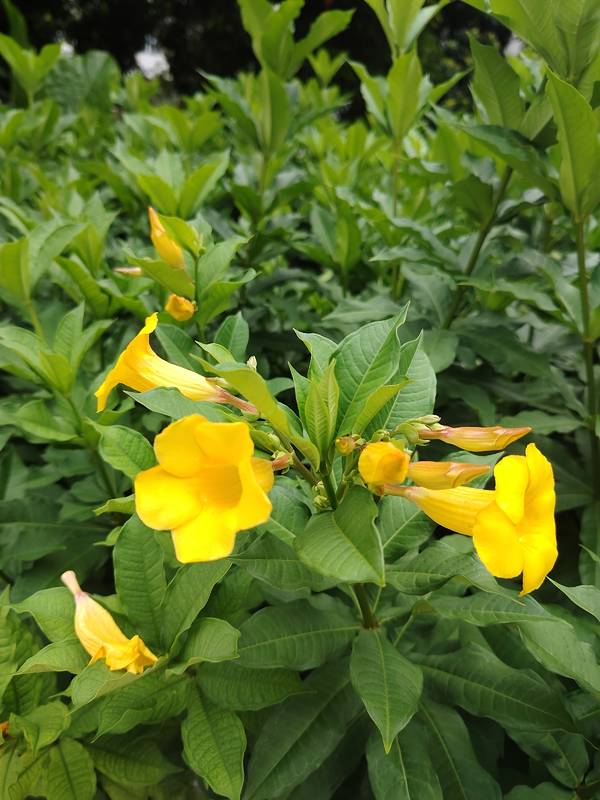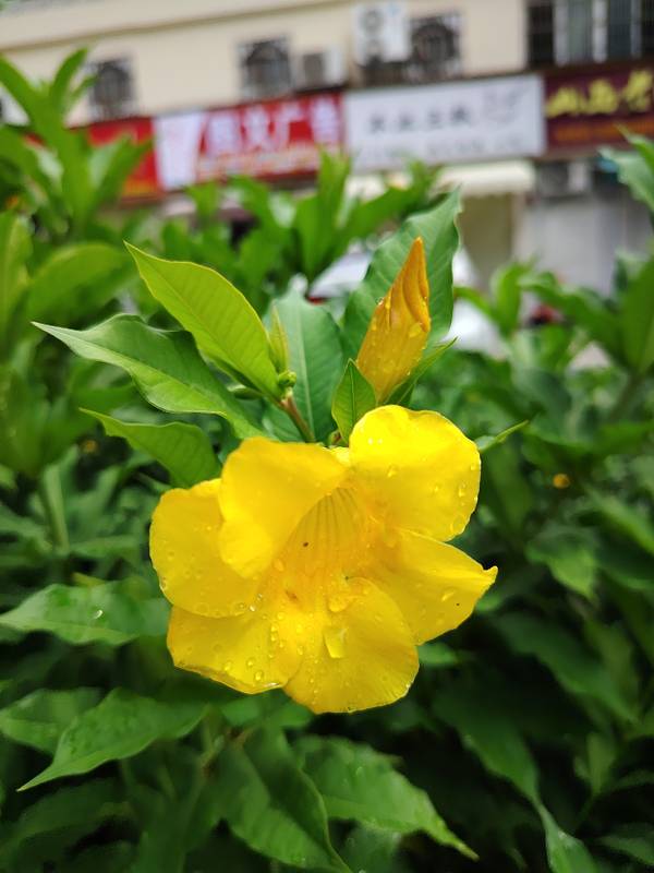 雨后的南宁民族大道,比人还高的荫生植物挂满雨露,黄蝉花也是一样挂满雨露,娇艳欲滴。