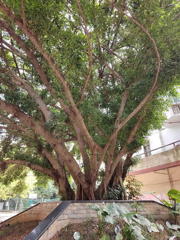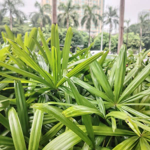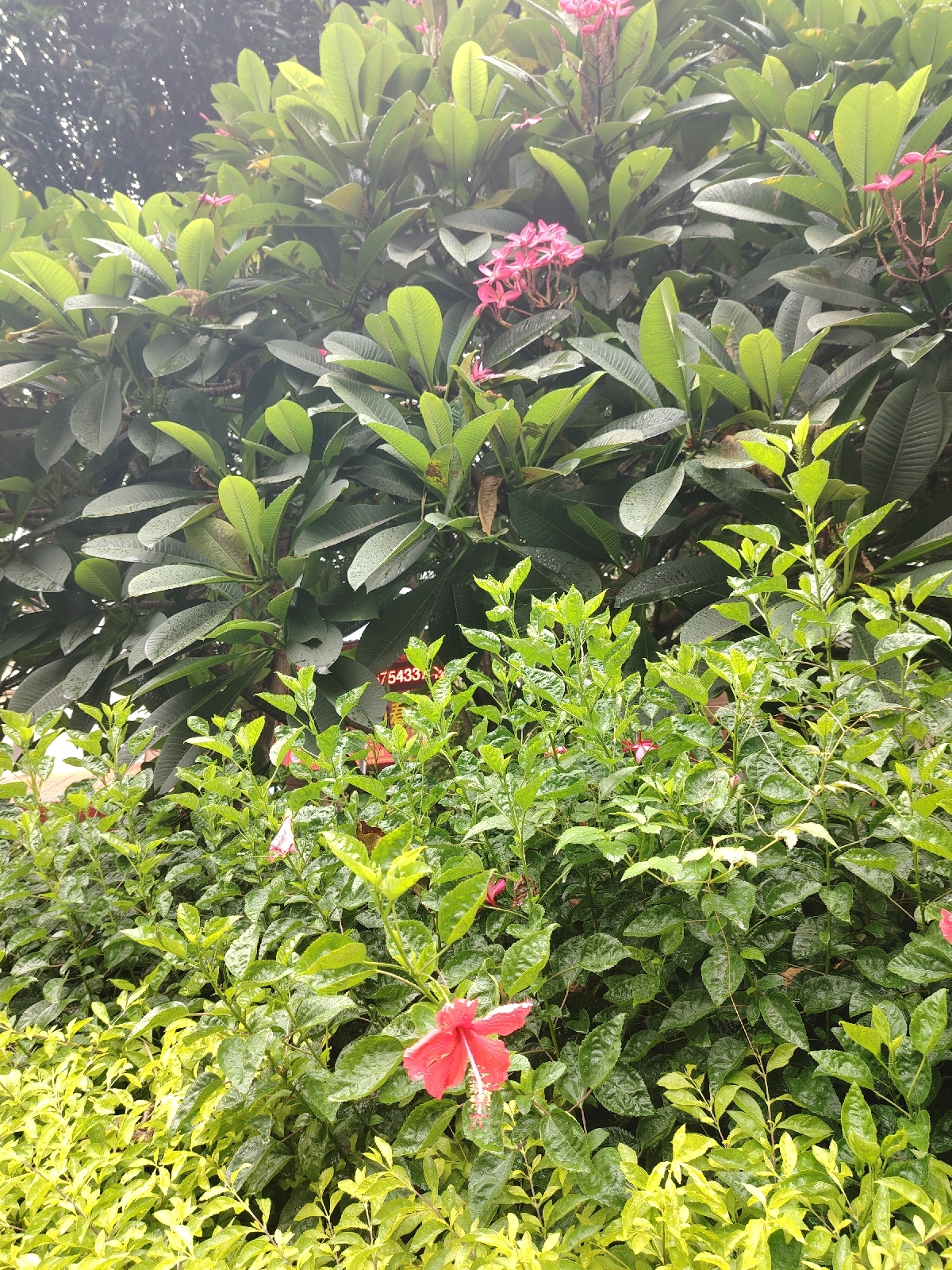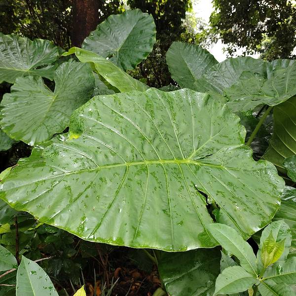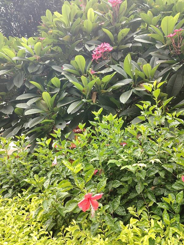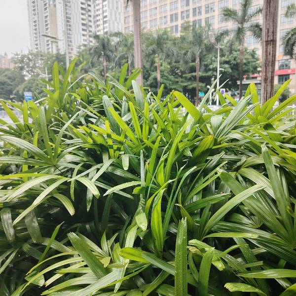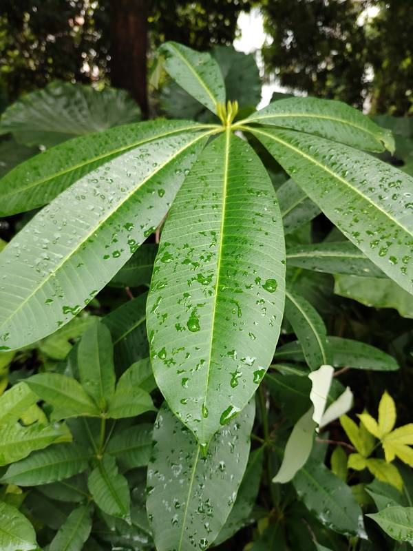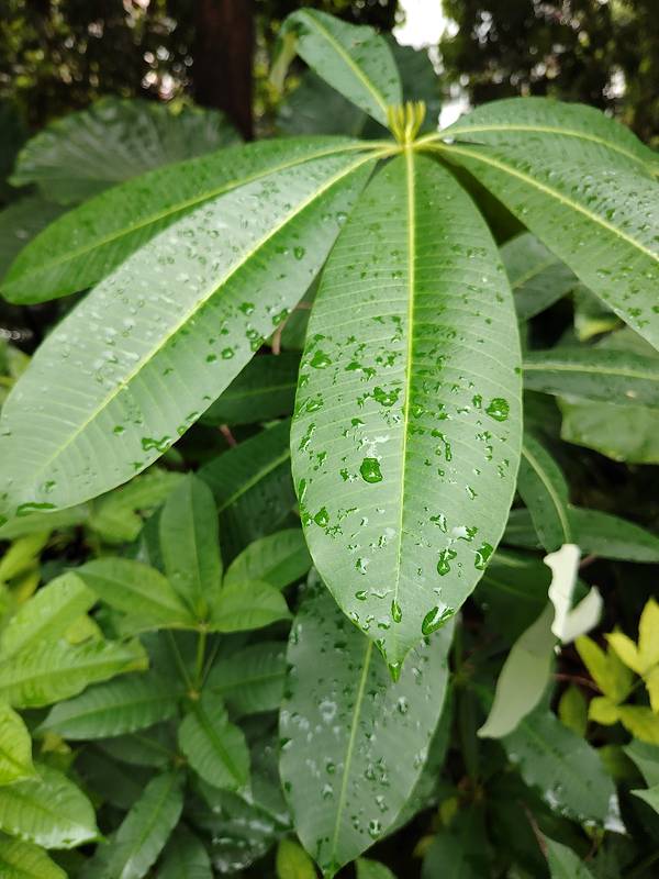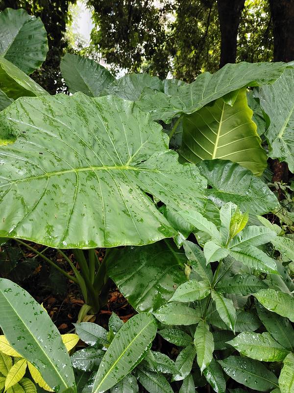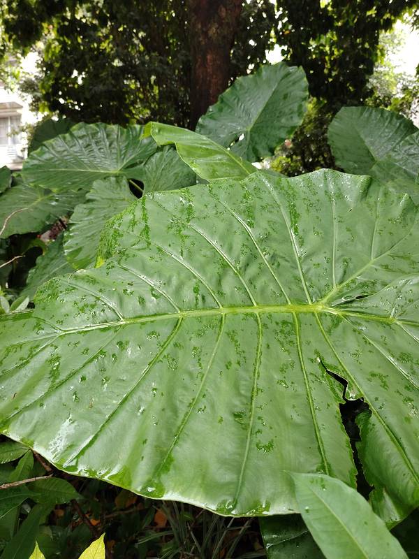 在南宁民族大道新华书店到广西图书馆这段,荫生植物长得比人还高,下雨后,大大的叶子都挂满雨露。