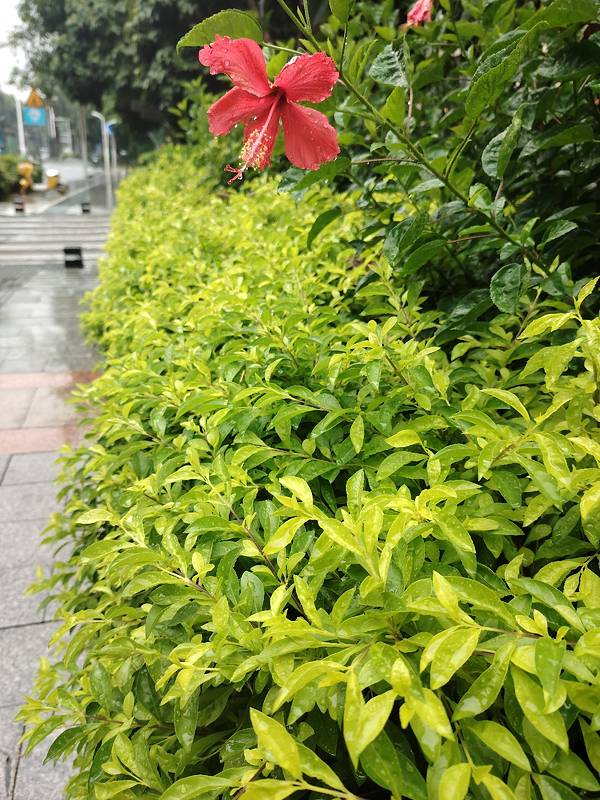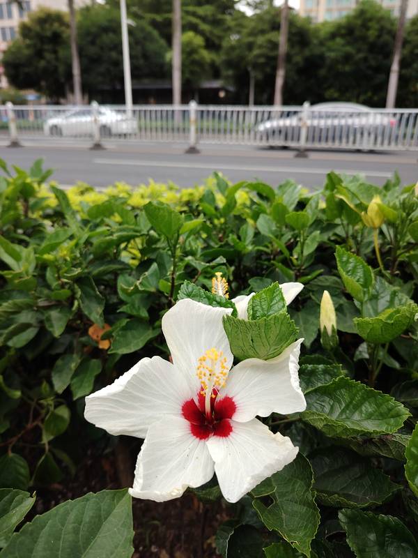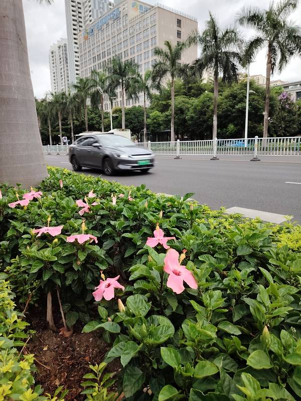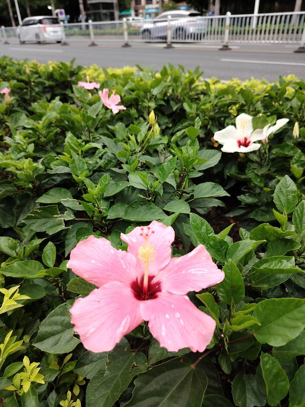 实况拍摄:南宁民族大道的朱瑾花真好看,在车流中,粉白和粉红花朵清新又亮眼,比大红的更让人赏心悦目。