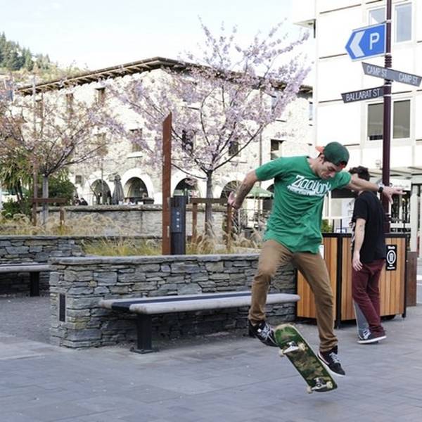 边上的步道可以直接通往镇中心,我晚上跑步到镇中心一个来回是7公里的样子. 话说回来新西兰美食还真不多,作为吃货的我们当然不能放过据说有米其林水准的RATA餐厅了,马上打电话订好位置,稍作休息便出发前往镇中心了. 滑板少年在NZ很常见.