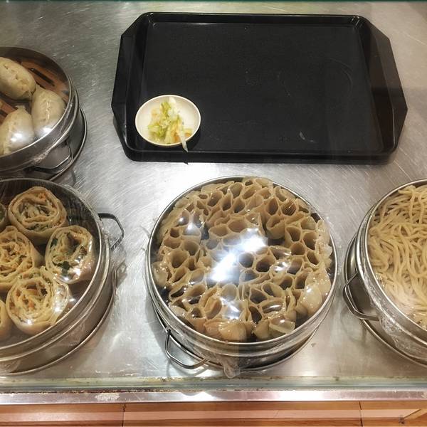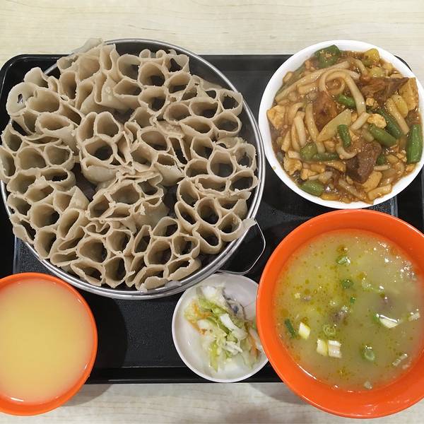 还有点时间,逛逛包头市中心,尝尝内蒙特色小吃“莜面”。 给大家科普一下,从左到右,它们的名字叫:莜面墩墩;莜面窝窝;莜面条条。 莜面的原料是燕麦,内蒙山西一带多食莜面。我点的是羊汤莜面窝窝+烩现菜,20元。 量太大,根本吃不完。 吃饱了继续火车,下一站,二连浩特。