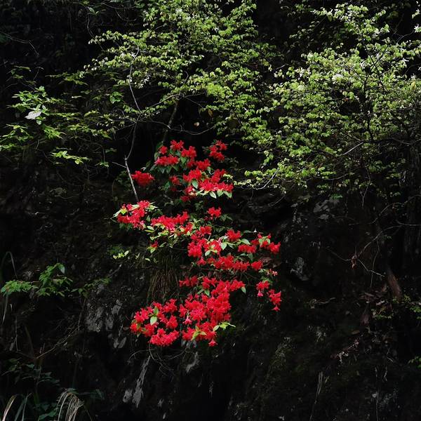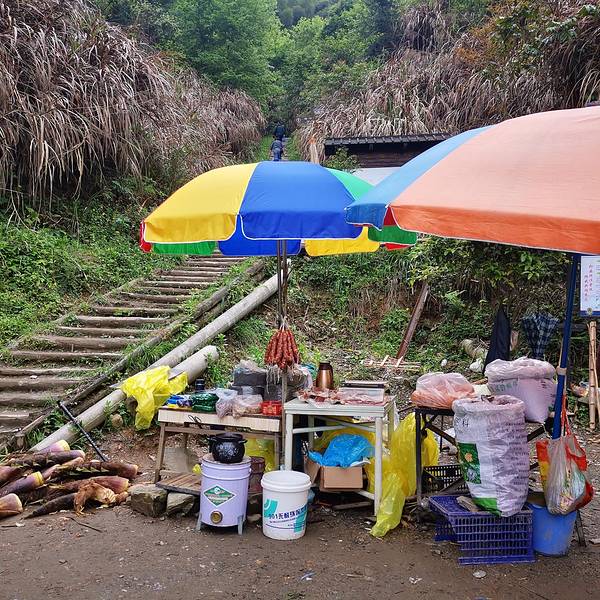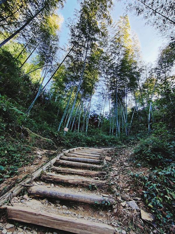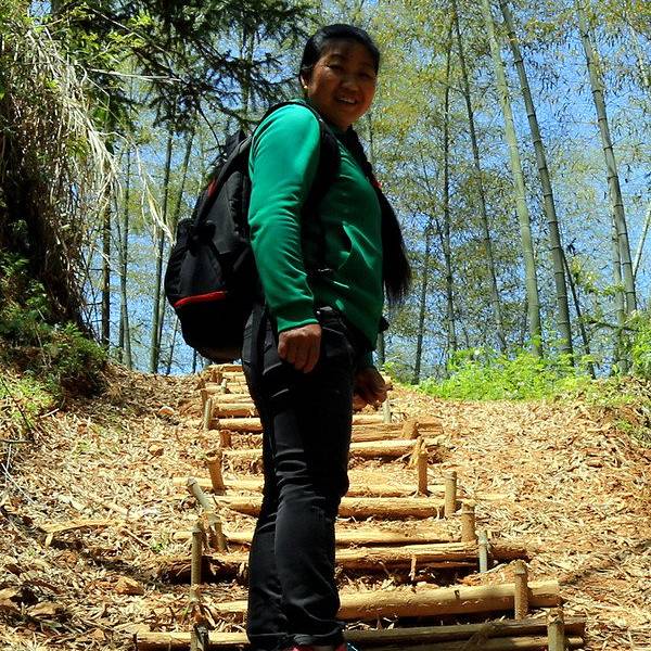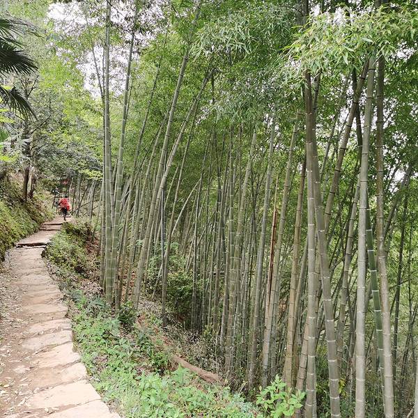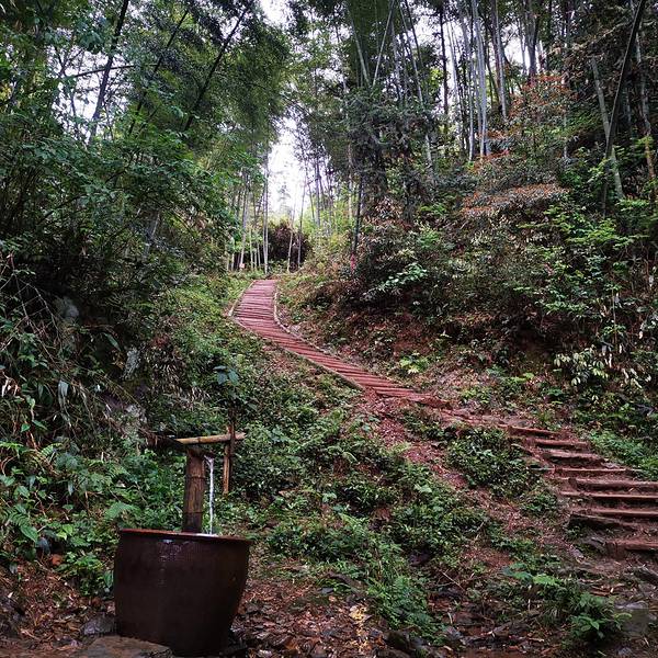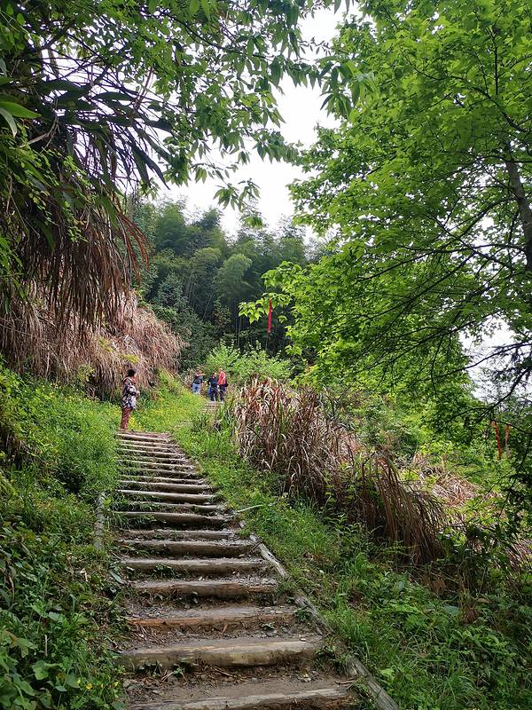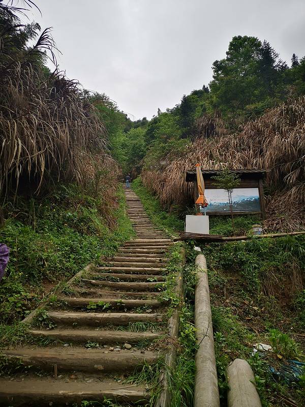 爬了才知道,这才是真正的山路。虽不算陡峭,但没有护栏,没有石阶。所谓的台阶,只是每隔一脚长的距离就用手臂粗细的木棍横在山坡上,然后两边再用两根细些的木棍竖直砸进砂石里,防止木棍下滑,从而形成一条蜿蜒的阶梯。有些地方平缓些,干脆就凿个砂石脚窝窝。这些所谓的台阶上都落着层厚厚的竹叶,踩上去软软地,还算舒服。但背着重重的行囊爬这样的山路却不是件舒服的事儿,爬一会儿就觉得心快要跳出来了,只得停下来喘口气。