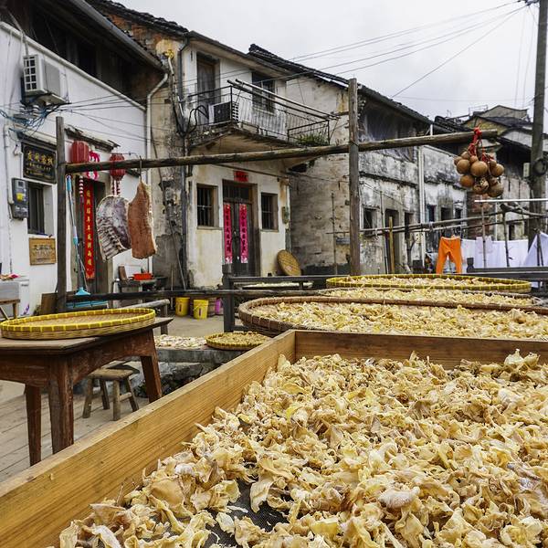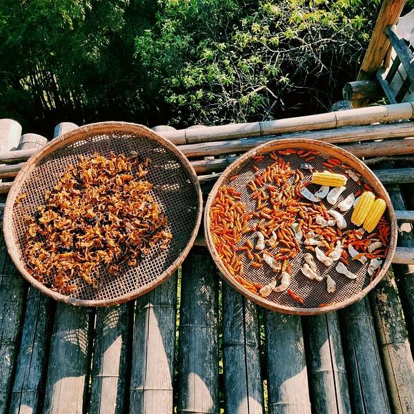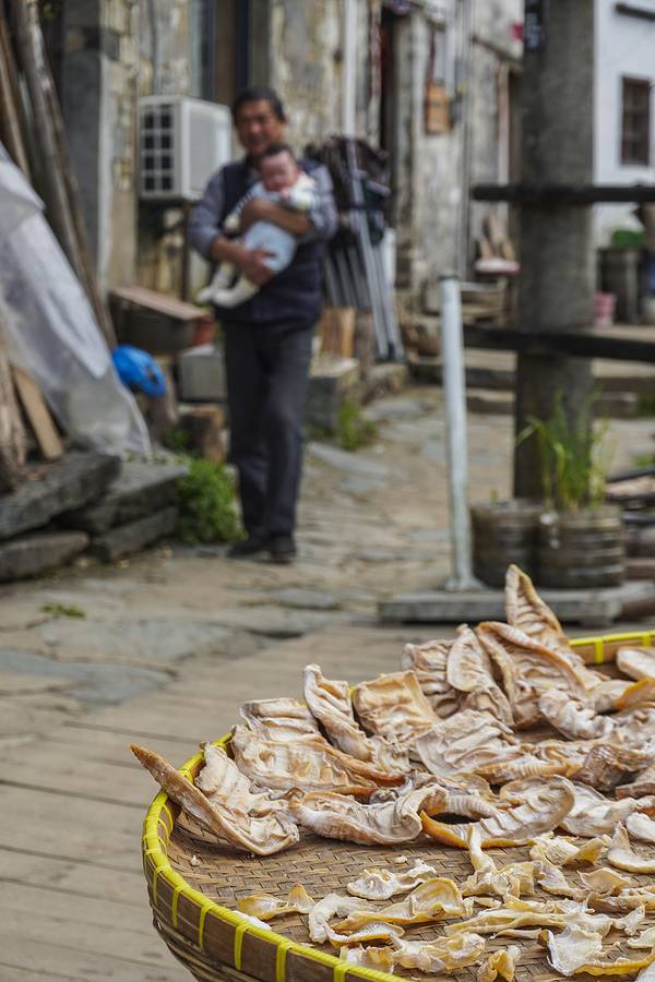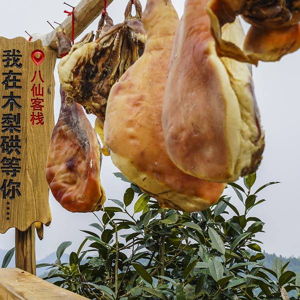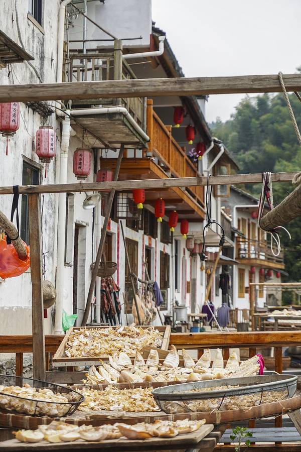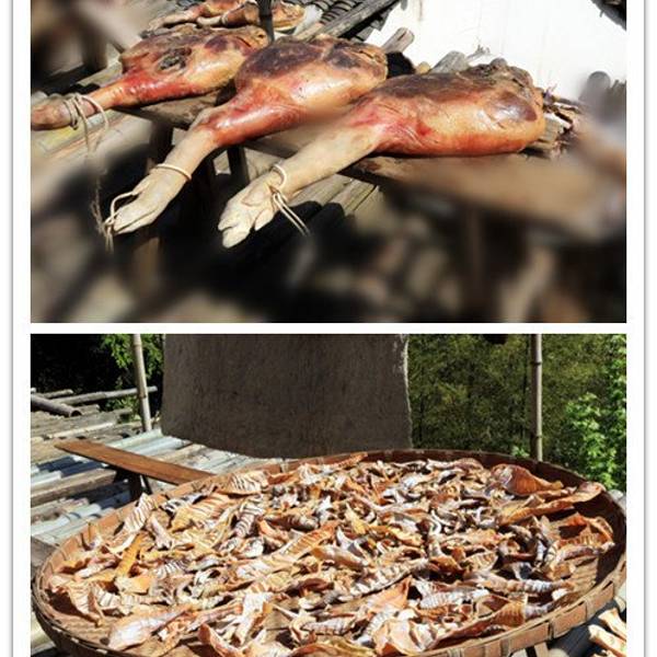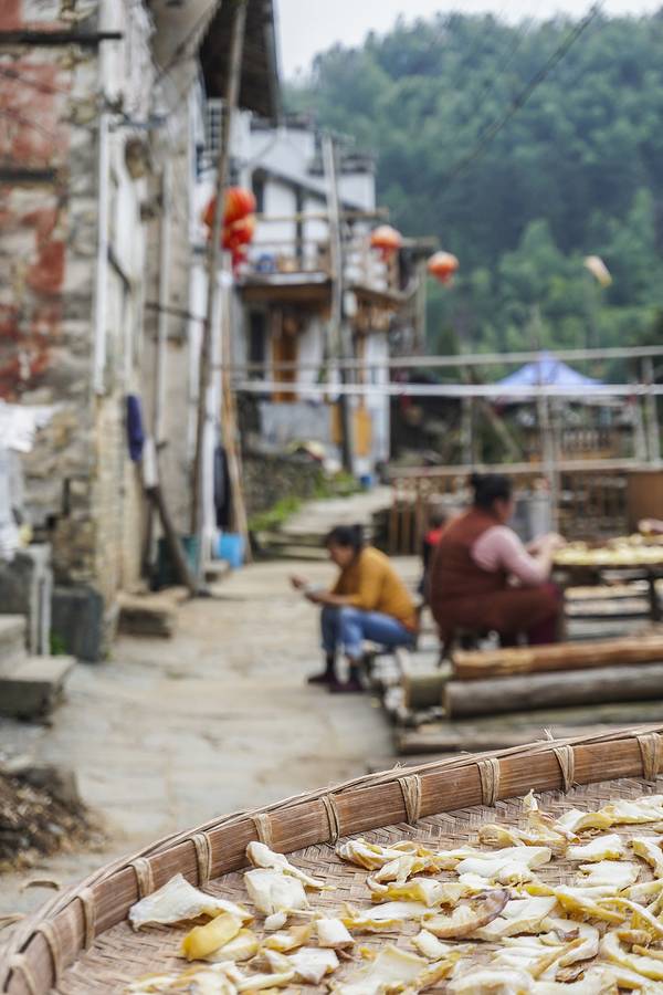 漫步村中的石板路,家家户户门前都悬挂着暗红色的腊肉,晾晒着竹笋、山菊花、竹耳以及一些叫不出名字的农作物,一派淳朴的生活景象。