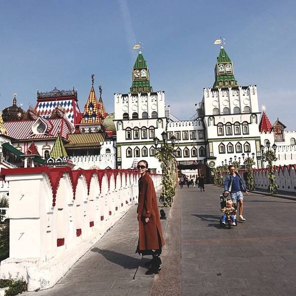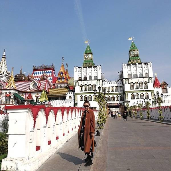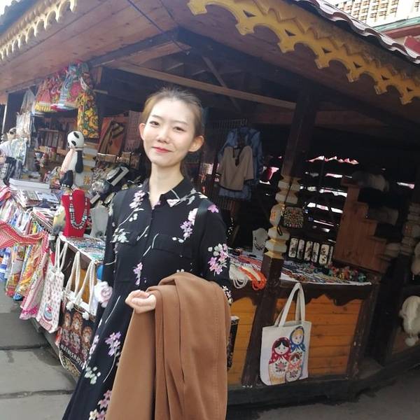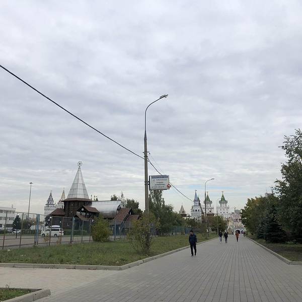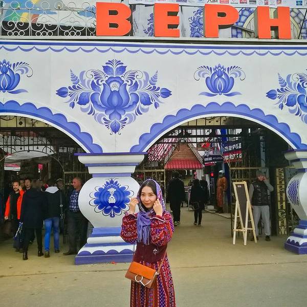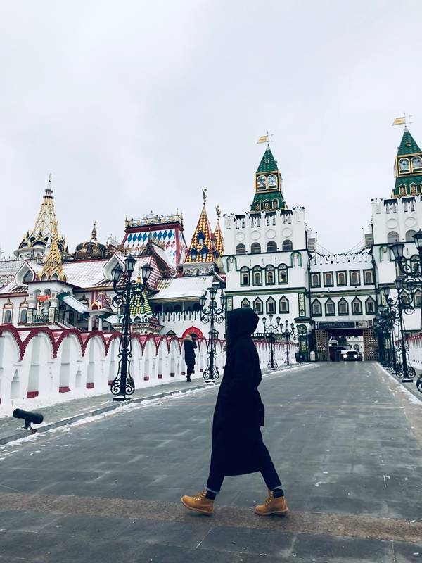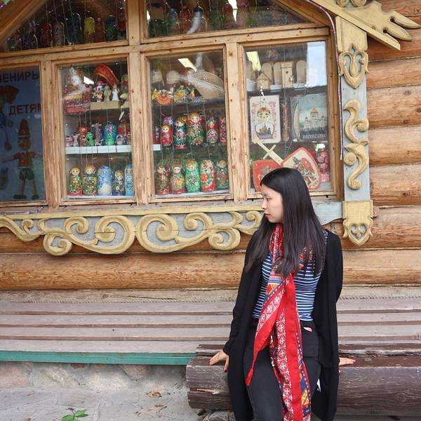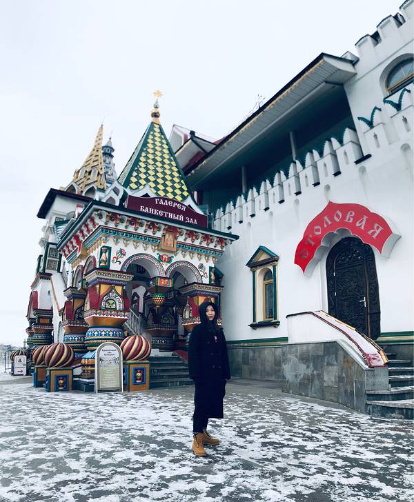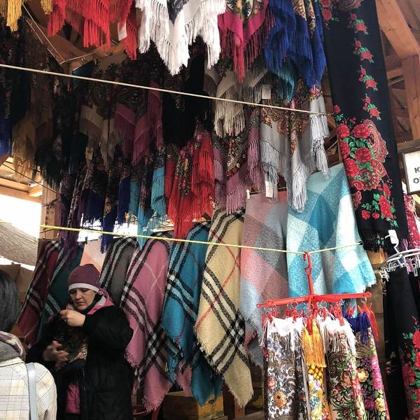 接下来的过程就很顺利了,走到市场的路上裸露着黄土,两边的建筑也是灰扑扑的有些衰败,确实是郊外的感觉。直走大概几百米之后来到市场的大门,第2行红底白字写的是Kreml' v Izmaylovo,也就是一只蚂蚁的克林姆林宫。如果时间充裕,建议不要急着进市场,先去左边这个克林姆林转转。我们因为天气太阴沉也没了拍照的兴致,便直接进了市场。之前提到过忘记把最保暖的大围巾带来,所以第一站就是寻找俄罗斯大方巾。门口走进去就看到有几家很大的店面,随意找了一家,看中的最好看的那块大方巾居然要1000刀,而别的都是800-3000卢布不等。尽管没有看到质感好的羊毛围巾,还是在热情的店主推荐下买了紫色和墨绿的两款不同花纹的方巾,讲价也是靠着中文,看来这座市场里的中文普及率要胜于英文呀。店主给我示范了不同的围法,包括最传统的俄罗斯头巾围法,为这个服务态度点赞。围上头巾有没有点儿像俄罗斯姑娘~