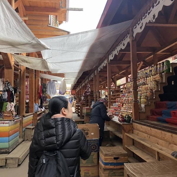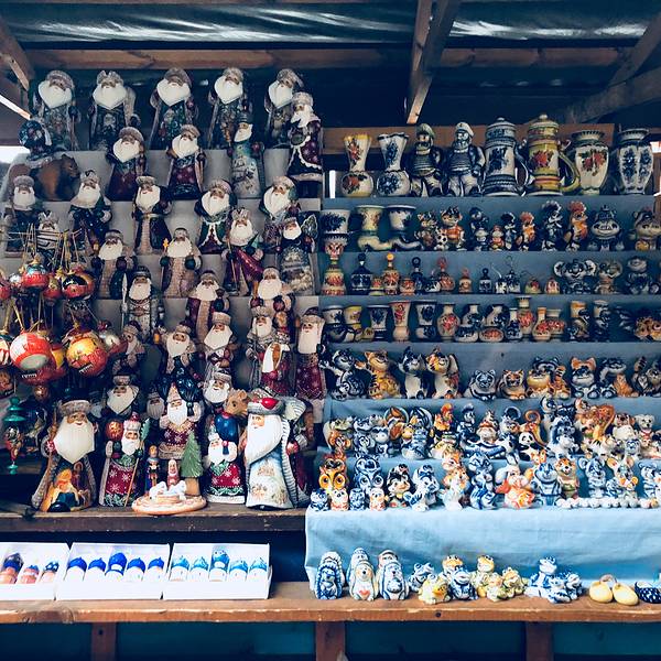 遇到一个很热情的卖套娃的奶奶,她还很快地拆了几组套娃给我们看~ 但是我们掂量着确实有点贵(一套7件的木质的绘画比较入眼的大约2500卢布),婉拒了。虽然有点不好意思,但是还是要果断点。后面的摊子我们都不敢站太近了~怕掌柜太热情。基本已经开摊的,卖的主要有套娃、围巾、冬季帽子、各种木雕、彩蛋、地毯等等工艺品。