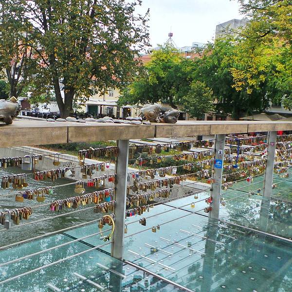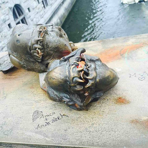 斯洛文尼亚的首都卢布尔雅那,有这样一座横跨卢布尔雅尼察河的行人桥被人们称作“屠夫桥”。这样具有艺术气息的桥竟然有这样一个并不雅观的名字。这个名字的来源来自于桥上的屠夫的雕像。后因为这座大桥造型别致,又十分的文艺,许许多多的情侣在这座大桥的围栏上挂上了属于自己两个人的同心锁,以此来纪念两个至死不渝的爱情。后来同心锁越挂越多,也成为了屠夫桥上另一道亮丽的风景线。