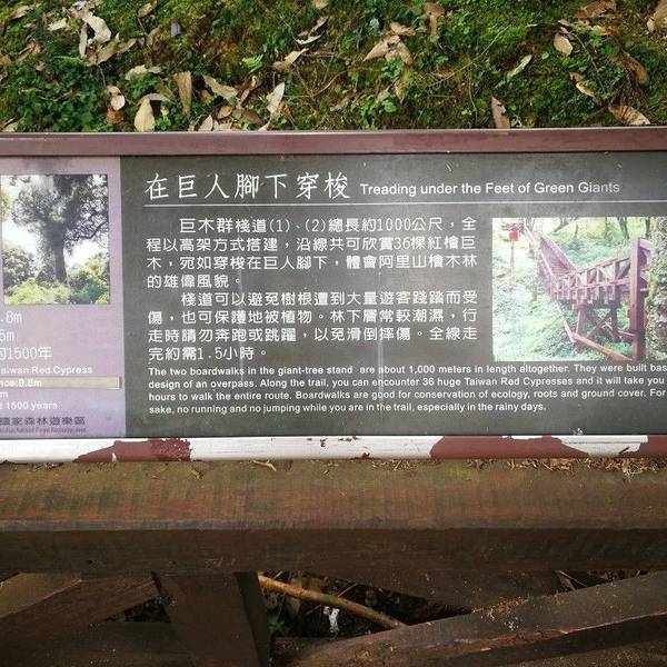 一号栈道全长六百公尺,沿线可以欣赏二十棵巨木...巨木群栈道分为两段,分别为一段和二段,总长约一千公尺,全程以高架方式搭建,沿线共可欣赏三十六棵红桧巨木,宛如穿梭在巨人脚下,体会阿里山桧木林的雄伟风貌。