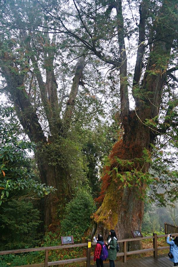 巨木群栈道是阿里山景区中一处被巨大的桧木遮蔽的步道,步道的两边都是巨大的桧木,这些桧木被人们赋予浓厚的人气,其中有趣的有四姊妹树,四姊妹是生长于同一块桧木的4株红桧,是二代木自然生长的最佳代表。原本老的桧木被砍伐后,其他的桧木种子飘到了树头上供应养分,最后生长出四株可人的桧木四姊妹。还有一处被命名为 金猪报喜,巨大的耳朵下垂两边,獠牙与鼻子在前方,活像一头山猪。最浪漫的一组叫做永结同心,两株桧木树头巧妙连成爱心形状,许多爱侣都要在这里拍照留下美好的回忆。 高耸的巨木群,相对之下,让人类显得好渺小。林区遮天蔽日,空气清新,让人赏心悦目。
