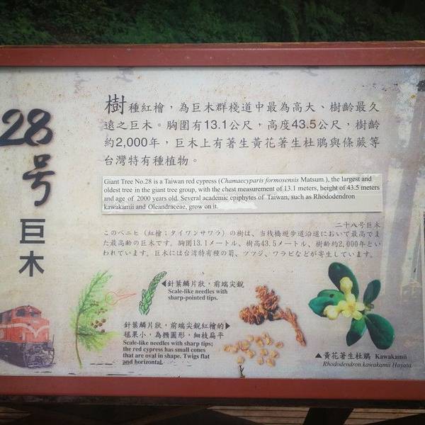 二号栈道全长四百公尺,沿线可以欣赏十六棵巨木,二十八号巨木尤为出众。