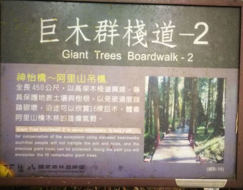 巨木群栈道是一条被千年古木荫蔽着的古道,全长600余公尺,两侧错落着阿里山古木巨木群栈道是一条被千年古木荫蔽着的古道,全长600余公尺,两侧错落着阿里山古木。栈道采用架高式设计,除可防止土壤及树根被践踏之外,亦可保护 红桧巨。