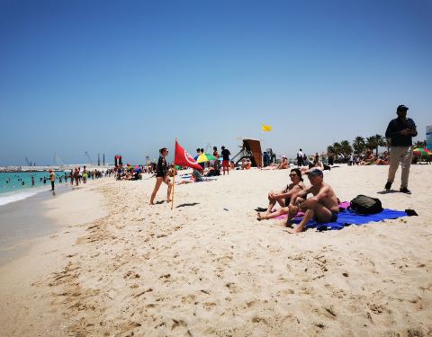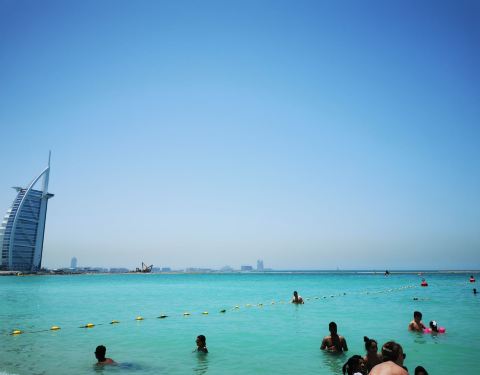 朱美拉公共海滩位于帆船酒店的东北方向,沙质柔软细白,前方是波斯湾湛蓝的海水,背靠一排豪华酒店。除了酒店私有沙滩,这里可以公开穿泳装,也是欣赏和拍摄帆船酒店的理想之地。 休闲放松 海滩上有公共浴场,可以租借沙滩椅。有的坐在海滩上欣赏海景,有的躺在沙滩上晒太阳,个个都悠闲陶醉,仿佛都沉浸在海滩的浪漫和海水的柔情中。远处的海中还可以看到游泳者和趴在冲浪板上,逆着海浪努力往外划着的冲浪者。