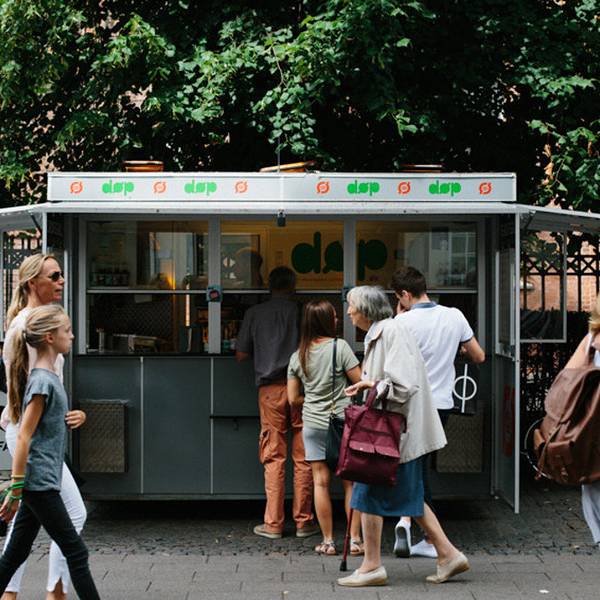Døp是一辆专门出售“有机”热狗的热狗车。在哥本哈根街头,热狗是一种极受欢迎的小吃,而热狗车则是一道流动的风景线。Døp共有两辆热狗车,一辆在圆塔附近,一辆在Strøget上的教堂前面。而Døp出售的热狗,从酱汁到配菜、到香肠、到面包,都是有机的。味道非常正宗,可以算是丹麦传统热狗的“有机升级版”。