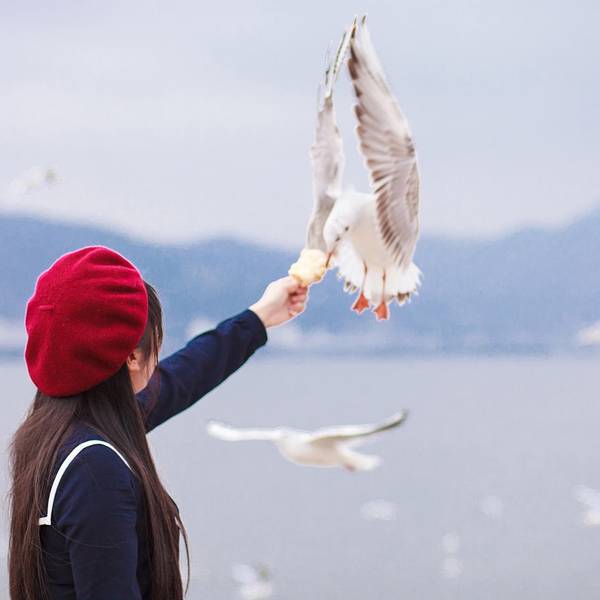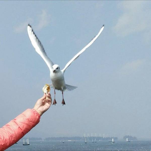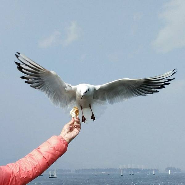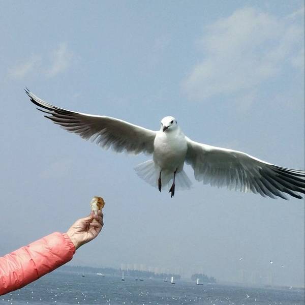 海鸥们会有很多一起飞过来吃你手上的面包,