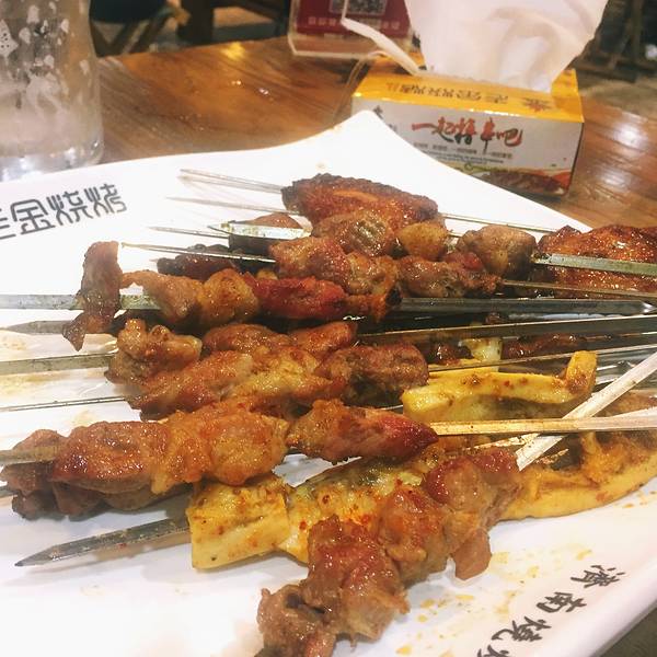 走了900m到趵突泉门口的老金烧烤,也是济南有名的连锁烧烤店。 他家销售模式很有意思,服务员把串成盆端来问你要不要,最后数签结账。我们去太晚了服务员流动的太慢,越吃越饿干脆走了。串的味道确实不错。掌中宝