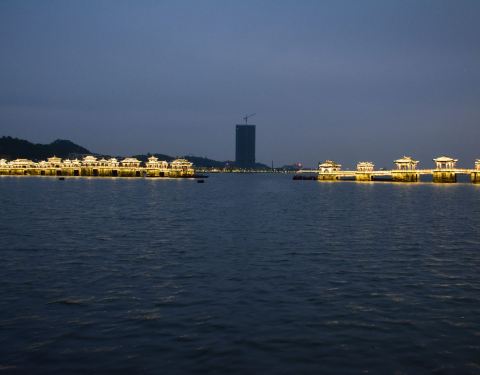 韩江是潮州这边的母亲河,由于这边的航运还有说其他的一些船运并不是特别的发达,所以水质上面保存的比较的好,看上去都是绿色的。 但是,虽然有人在这里游泳。近岸的地方还是有比较的多污渍。 晚上这边会开灯挺漂亮的。