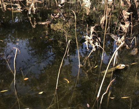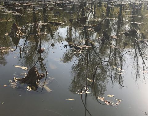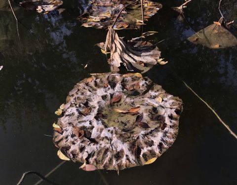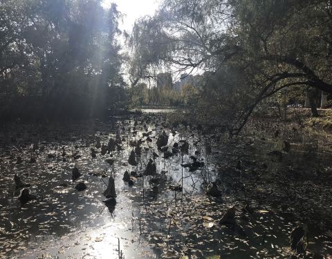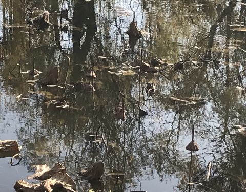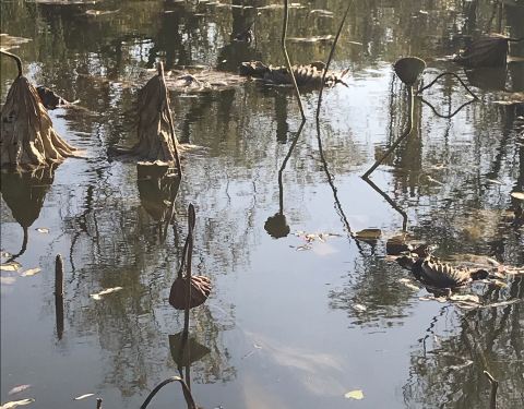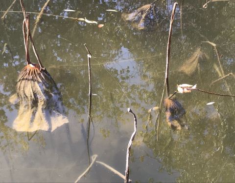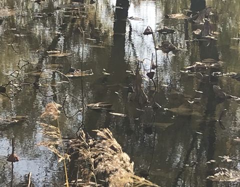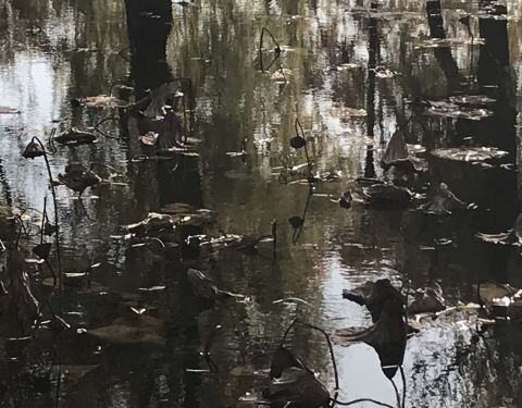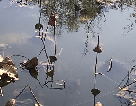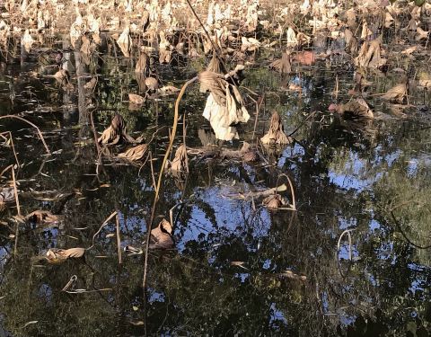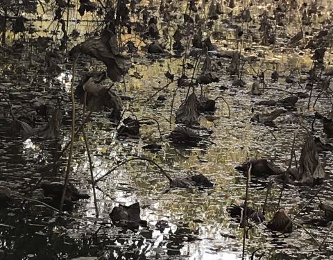 饭后无心午休,便乘着暖阳来到渭滨公园感受着秋末冬初的醉美景色饭后无心午休,便乘着暖阳来到渭滨公园感受着秋末冬初的醉美景色! 路过荷塘,目光被深深吸引,那别样的、凋零的美…… 花,早巳凋零,无影无踪, 荷叶,干枯,萎缩, 零星的苍绿伴着斑驳枯黄, 倔强的探出头...饭后无心午休,便乘着暖阳来到渭滨公园感受着秋末冬初的醉美景色! 路过荷塘,目光被深深吸引,那别样的、凋零的美…… 花,早巳凋零,无影无踪, 荷叶,干枯,萎缩, 零星的苍绿伴着斑驳枯黄, 倔强的探出头, 凸显生命最后的凄美! 往昔,一池碧绿艳红,十里飘香, 而今芳华褪去,满目沧桑…… 偶有几个干瘪莲蓬, 松松挂在尚存一丝绿意的荷梗上, 孤寂,随意! 莲子,早己脱离母体, 杂乱散落在水塘里, 来年满池的新芽用绿色覆盖, 那将是怎样的一种景象…… 展开