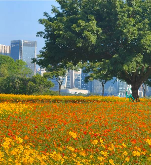 除了绚烂的花海,闽江赋予的江景资源更是公园的“灵魂”。花田紧邻闽江防洪堤,沿着堤岸步道漫步,左手是繁花似锦的田园风光,右手是奔流不息的闽江碧波,远处鼓山如黛、大桥飞架,江风裹挟着水汽与花香扑面而来,瞬间涤荡掉城市的喧嚣。清晨时分,江面上薄雾未散,花田在朦胧中若隐若现,偶有白鹭从水面掠过,宛如水墨画中的留白;黄昏时分,夕阳为江面镀上金边,花田被染上暖橙色,情侣们依偎在长椅上看落日,构成一幅温馨的生活图景。公园还贴心地在沿江地带设置了观景台和休憩亭,无论是驻足远眺还是静坐发呆,都能感受到“江风、花影、城韵”交织的惬意。