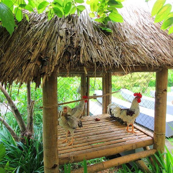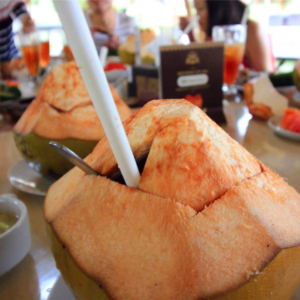 制作完巴迪克,我们出发去Bale Udang,Crispy Duck吃午饭,这里最著名的就是脏鸭餐了。脏鸭餐到巴厘岛必需品尝的特色美食,当然,和博大精深的中国饮食来比,可能脏鸭餐的烹饪方法并不为奇,但是配上密植的酱汁和当地独有的风光,脏鸭餐就可以称之为到巴厘岛最具代表性的美食,不论你对它的味道如何评价,不亲身体验美味的话,等于没有到过巴厘岛。餐厅的风格很是意境,有着各种各样的茅草屋为餐厅,一桌10人,边用餐边欣赏这里美景,好不惬意。脏鸭餐到巴厘岛必需品尝的特色美食,当然,和博大精深的中国饮食来比,可能脏鸭餐的烹饪方法并不为奇,但是配上密植的酱汁和当地独有的风光,脏鸭餐就可以称之为到巴厘岛最具代表性的美食,不论你对它的味道如何评价。中国人的饮食文化喜欢好彩头的菜名,以吸引食客们的食欲兴趣。把“脏”字放入菜名中真的算是奇葩了。关于“脏鸭”的名字来历,有两个版本:一是鸭子散养在巴厘岛有名的水稻田里,吃野外小虫小鱼,常常搞得浑身泥巴;就餐区分为桌式及独立凉亭盘腿区,我们选择了可以容下10人就餐的独立凉亭,可以盘腿而坐。清风从稻田上吹过,面对美味,人生的快意想必也不过如此了!脏鸭餐是好几种小菜搭配的套餐,放在翠绿的芭蕉叶上,颜色就让人食欲大增:半只鸭子烤成棕色,用手一撕,酥酥脆脆的,放进嘴里却没有太油腻的感觉;更难得的是,丝毫没有鸭腥味。原来是烤制之前,会用由多种本地香料。当然,品尝完油炸的脏鸭餐和配菜,来一份椰子水也是再好不过的了。