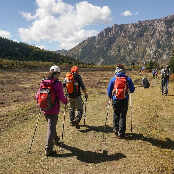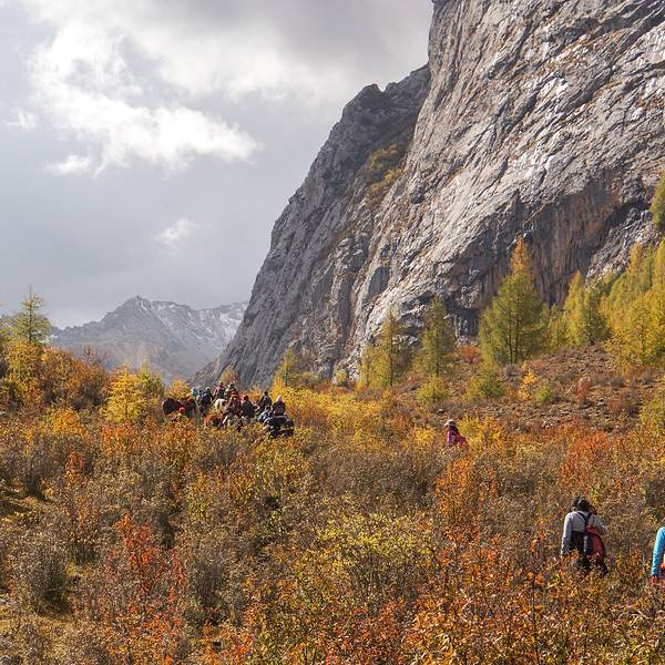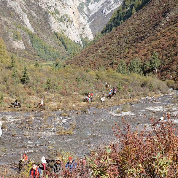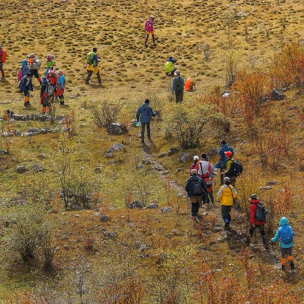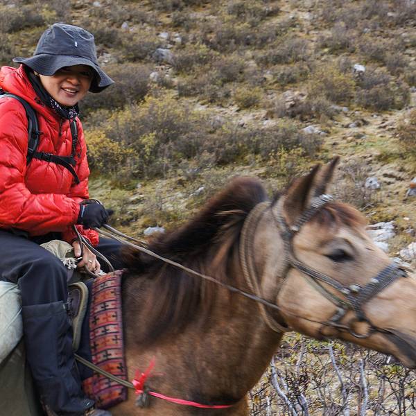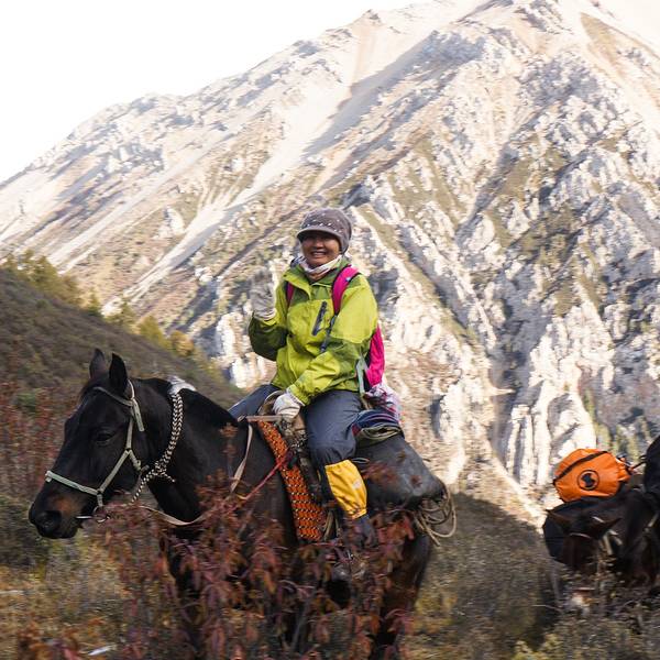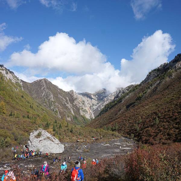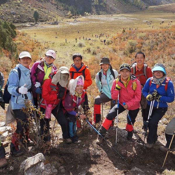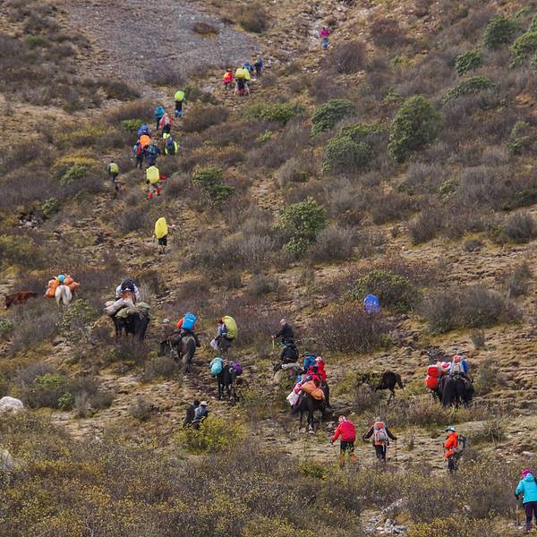 在一片荒芜的原野上,视觉上很是震撼。还有美丽的雪山,一路伴我们前行。喜欢这样的独行的背影。继续上路准备上路了,今天的行程从一个800米的攀登开始。历经了昨天的痛苦自虐,有人明智地选择了骑马。600米的海拔,路途大概只有2公里,预计需要两个小时。连续两个小时的海拔上升,而且是在4000米之上,对于平时没有锻...准备上路了,今天的行程从一个800米的攀登开始。历经了昨天的痛苦自虐,有人明智地选择了骑马。600米的海拔,路途大概只有2公里,预计需要两个小时。连续两个小时的海拔上升,而且是在4000米之上,对于平时没有锻炼的人来说确实也是一个挑战。在山坡上偶遇一具完整的动物遗骸,根据大小身型应该是牦牛的遗体。在一片荒芜的原野上,视觉上很是震撼。于是也就有了这张我最爱的相片,仿佛这么多年的徒步故事,尽在其中。但当然,并不是只有沧桑感才是徒步的背景音,这样的旅程,各种欢乐。还有美丽的雪山,一路伴我们前行。来张大合照吧,下次同行,不知是否又要7年。继续上路。对于这一路的熙熙攘攘,表示相当无语。钻石,一个十四岁的男孩,是心仪朋友的孩子,跟着我们出来锻炼。也许是年龄带来的羞涩,一路表现得很腼腆,体力极佳,总是一路独行。喜欢这样的独行的背影。秋色,层层染上草甸。可以想象,再过半个月,这里也许就如水彩画一般的灿烂。对于徒步,也许不同的人有不同的解说。这样一种默默在雪山间前进的状态,也许只有当下,才能感应。远处的云海,这个时候看见也只是觉得漂亮,却没人知道它在未来将给我们带来什么。 展开