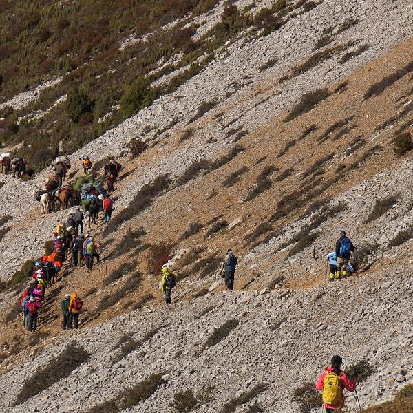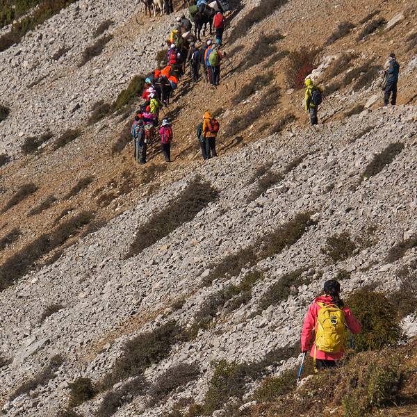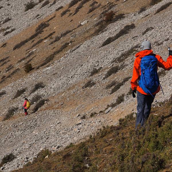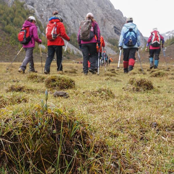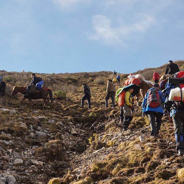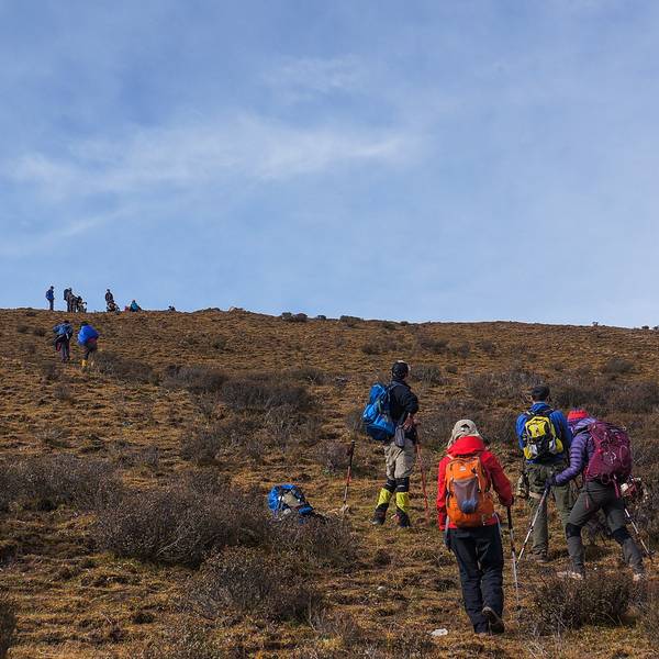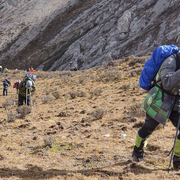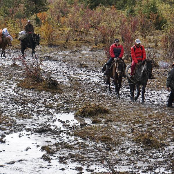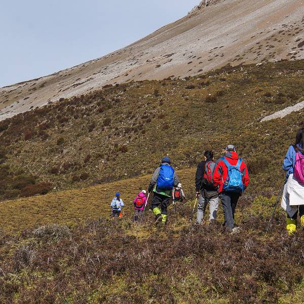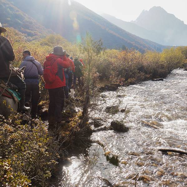 在一片荒芜的原野上,视觉上很是震撼。还有美丽的雪山,一路伴我们前行。喜欢这样的独行的背影。继续上路准备上路了,今天的行程从一个800米的攀登开始。历经了昨天的痛苦自虐,有人明智地选择了骑马。600米的海拔,路途大概只有2公里,预计需要两个小时。连续两个小时的海拔上升,而且是在4000米之上,对于平时没有锻...准备上路了,今天的行程从一个800米的攀登开始。历经了昨天的痛苦自虐,有人明智地选择了骑马。600米的海拔,路途大概只有2公里,预计需要两个小时。连续两个小时的海拔上升,而且是在4000米之上,对于平时没有锻炼的人来说确实也是一个挑战。在山坡上偶遇一具完整的动物遗骸,根据大小身型应该是牦牛的遗体。在一片荒芜的原野上,视觉上很是震撼。于是也就有了这张我最爱的相片,仿佛这么多年的徒步故事,尽在其中。但当然,并不是只有沧桑感才是徒步的背景音,这样的旅程,各种欢乐。还有美丽的雪山,一路伴我们前行。来张大合照吧,下次同行,不知是否又要7年。继续上路。对于这一路的熙熙攘攘,表示相当无语。钻石,一个十四岁的男孩,是心仪朋友的孩子,跟着我们出来锻炼。也许是年龄带来的羞涩,一路表现得很腼腆,体力极佳,总是一路独行。喜欢这样的独行的背影。秋色,层层染上草甸。可以想象,再过半个月,这里也许就如水彩画一般的灿烂。对于徒步,也许不同的人有不同的解说。这样一种默默在雪山间前进的状态,也许只有当下,才能感应。远处的云海,这个时候看见也只是觉得漂亮,却没人知道它在未来将给我们带来什么。 展开