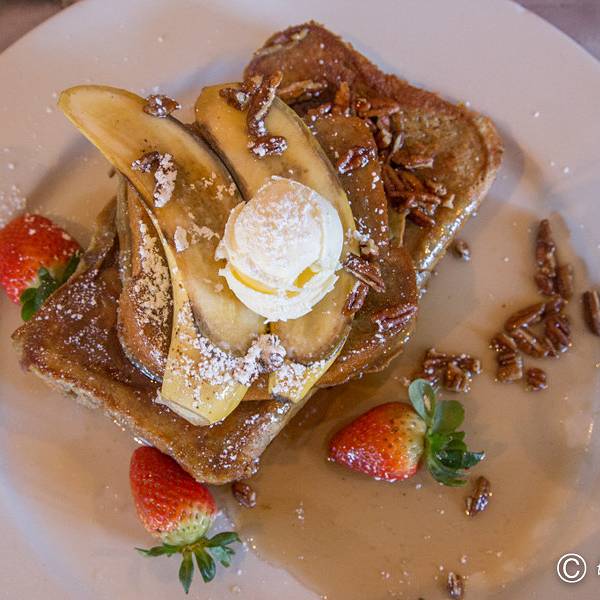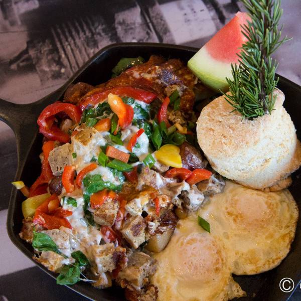 网上接近五千好评的早餐店在圣地亚哥也是很少见的。Hash House A Go Go每道菜的制作和摆盘都融入了特有的设计。它对自己的定位是“提供扭曲的乡村食物”(Twisted Farm Food)。可想而知,食物的摆盘不是法餐那种精简的设计,更多体现的是美国人不拘小节的粗犷随性。就拿最有名的Meatloaf Hash为例,在比人脸还大的铁锅中盛入满满的食材,配菜的松饼上还插了一枝松树枝做装饰。随处体现粗旷的气质,与其宣称的乡村食物主题十分吻合。