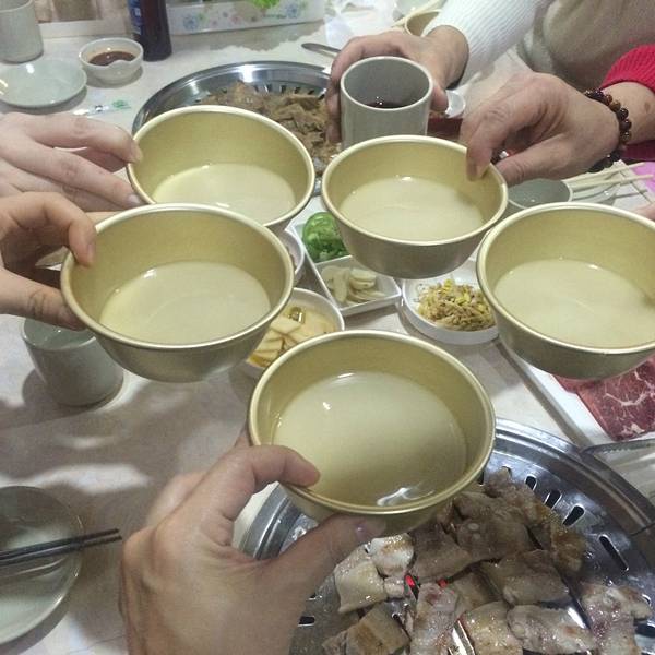 晚上就在我们住宿的酒店后面的这家五花上奖炭火烤肉店吃咯,是朝鲜特色烤肉,里面的自制米酒好好喝~米酒是