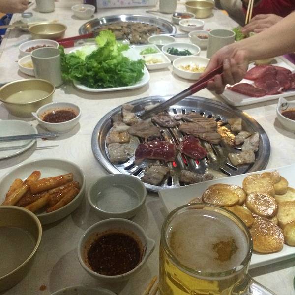 晚上就在我们住宿的酒店后面的这家五花上奖炭火烤肉店吃咯,是朝鲜特色烤肉,里面的自制米酒好好喝~米酒是用銅碗喝的……来,干了!生菜包着肉吃,爽~有一种韩式的叶子,味道好特别,可以一试,我喜欢但我觉得是...