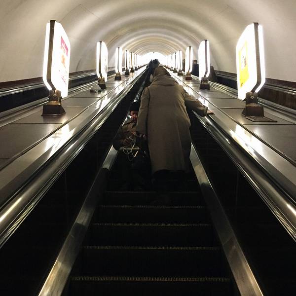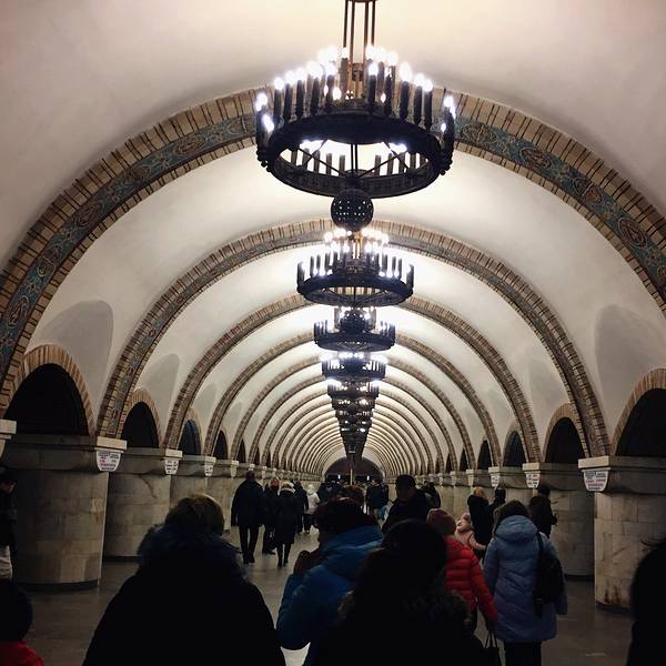 去往酒店的路上,路过一座天桥,可以俯瞰 基辅 火车站。 入住酒店休整一下后,直接坐地铁出发。 乌克兰 地铁大都在苏联时期建设,深度普遍在100米上下。电梯运行飞快,在电梯尽头特意设置了一个向上的小斜坡,以抵消电梯快速运行的惯性。我和L在大学站上车,军械厂站下车。军械厂站号称是世界上最深的地铁之一,超过120米。