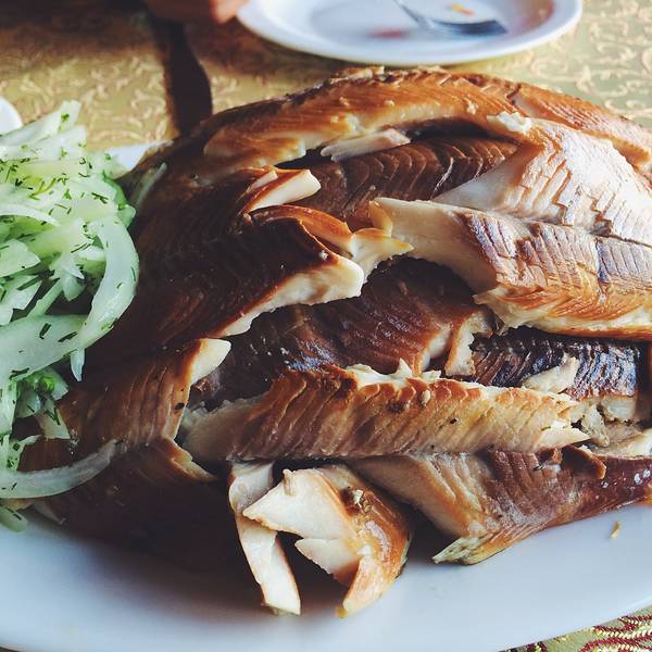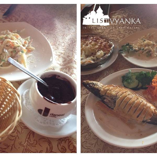 饥肠辘辘地沿着湖边走到LP上推荐的Proshly Vek,这是一家航海主题的专注做鱼的餐厅,毕竟就在贝加尔湖旁边,就地取材嘛。二楼靠窗的座位可以看到贝加尔湖,墙上挂满了一些老旧的渔船上的设备,比较有意思。点了菜单上最贵的菜——烟熏Omul(Omul是贝加尔湖里的一种鱼,跟三文鱼是近亲),结果却是有点失望。Omul本身很新鲜,但没有任何酱料,干巴巴的烟熏口味,淡而无味,也许当地人图得就是原汁原味吧。面对一大盘小山一样堆着的贝加尔湖特产,我们只好互相鼓励,就当是补充蛋白质,当饭吃吧。边吃边觉得所有去过中国的俄罗斯人都会被我们五花八门的做鱼的方法惊艳到吧。这顿吃了2150卢布,相对当地的物价已经算大餐了。
