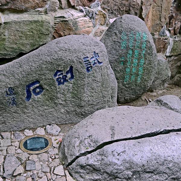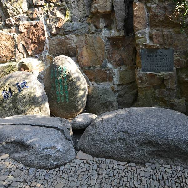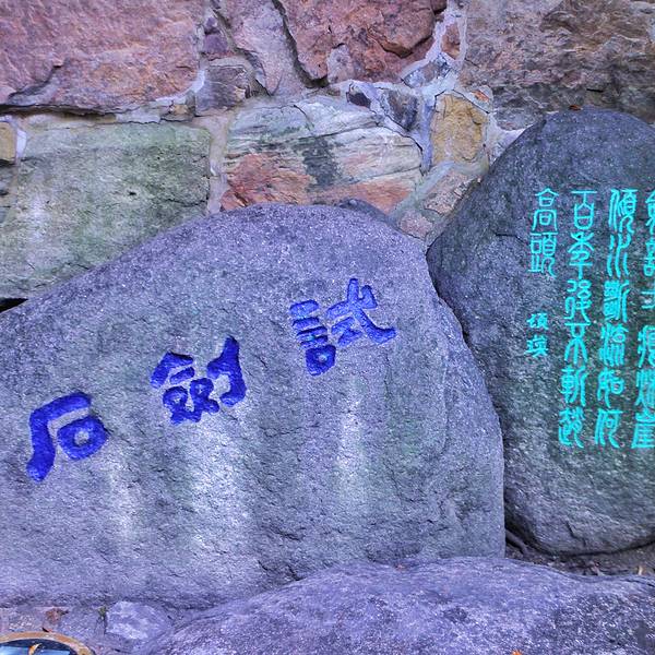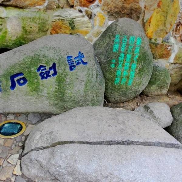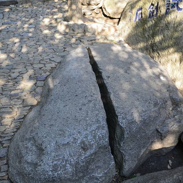 在苏州虎丘附近的上山路东侧,有一巨石像被人切开一样,矿苏州虎丘试剑石亡刻有“试剑石”三字。题刻引出两则传说:一传吴王阖闾得到干将所献的“莫邪”剑后,挥剑试石,将大石一劈为二;又传秦始皇来虎丘,掘得为吴王殉葬的鱼肠诸剑以后,在此试剑所致。一说秦始皇到苏州寻找吴王墓中剑,不得,怒而将大石劈为两瓣;又说秦皇方欲掘墓挖剑,却见一白虎当坟蹲踞,遂拔出身上之剑奋力向白虎砍去,未中虎身却误砍了石块,留下此痕。今试剑石旁刻有元代顾瑛的一首诗:“剑试一痕秋,岩倾水断流。如何百年后,不斩赵高头?”针对秦王试剑石的传说而作,略带调侃语气。此大石中开如截,酷似剑劈。实际上是大海的遗留物,是典型的凝灰岩,久经风化所致。