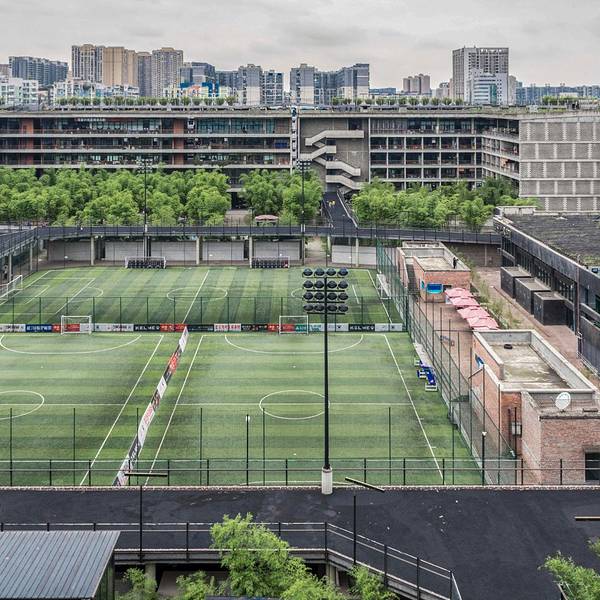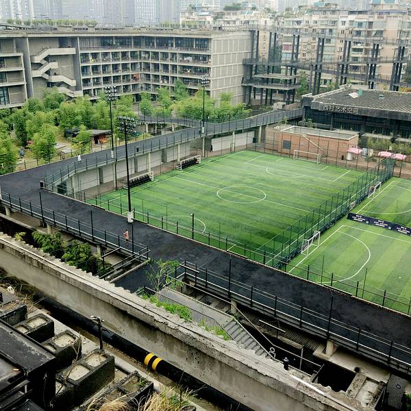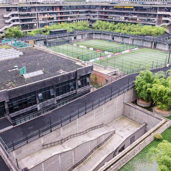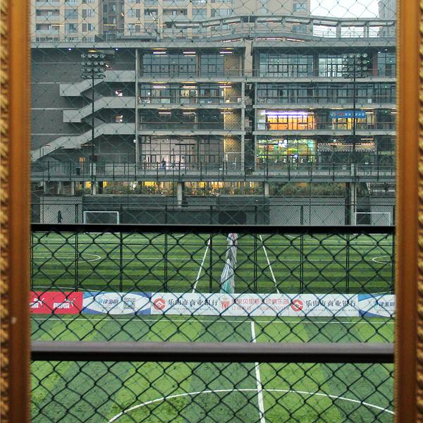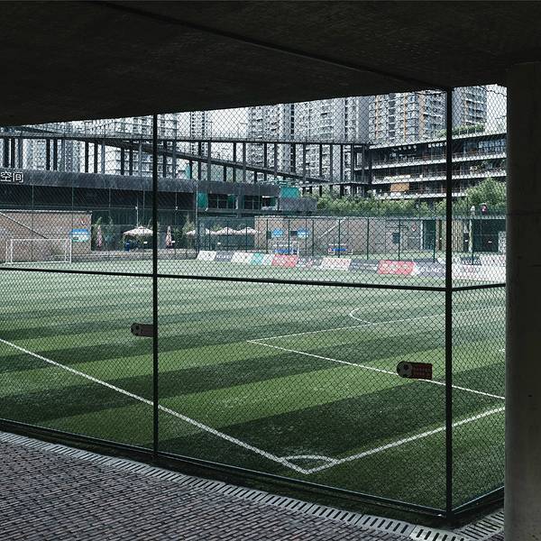 只是可惜这里在航线底下,无法用无人机航拍,不然效果应该会更震撼~西村贝森,指位于成都市青羊区贝森北路的“西村文创园”,整个看上去就是一加大版本的四合院,四四方方的一圈建筑,中间却弄了一个俱乐部的足球场,看上去很有特色。