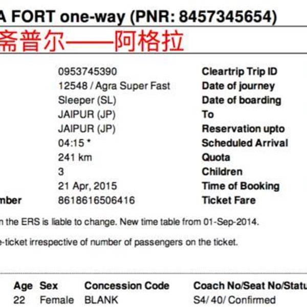 今天下午三点的火车去斋普尔,酒店十点半退房,中途还有几个小时的时间需要消磨掉。只好又在乌代布尔的城区中穿梭,去食堂吃饭了…因为食堂吃饭基本上要花一个多两个小时,加上路上慢慢走,也还是挺悠闲的。 吃过午饭,再返回酒店,小坐了二十分钟,准时两点出发去火车站了。酒店离火车站大概2公里远,走到路口遇到个tutu车,问了价格,司机挺靠谱的,喊价50rs。于是直接上车,大概开了五六分钟就到火车站了。乌代布尔的火车站不大,第一次坐印度火车,规矩还不是太清楚,所以早到了火车站,研究下如何坐印度火车。印度火车不需要检票入站神马的,也没有安检,直接上车。走到门口,就有提示车次和停靠的站台。不过那个D2至今没有弄明白是神马意思。不知道是不是只有一个站台的缘故,只看到一辆火车。旁边有电子显示屏提示停靠车辆的车次和每节车厢所对应的编号。比如今天我们坐的是空调座椅的cc,所以对应的就是c1。车身上也标有车次,和车前往的方向。车找好了后,对应的车厢找好了后,你会发现车厢门边贴有一个乘客名单列表,找到你的名字和对应的座位信息,确认无误是这趟车就彻底的万无一失了。空调车厢大概离出发还有半个小时的时候才开门进入,进入车厢,发现座椅空间挺大的,有些坐飞机头等舱的感觉。虽然座椅和车厢不算特别干净,但是也挺舒适的。乘客也大多挺干净的,没有神马围观的现象发生。 列车准点启动出发,居然挺安静的,没有斯里兰卡火车的那种巨大的声响。和国内的动车相比,也只是声音稍微大了点点而已。边上还有充电的插座,不过幸好没有充,国内在印度工作过的朋友,说那个插座挺坑爹的,电压不稳定,他有两个笔记本电源的适配器就是用这个插座报废的…一路停靠的站点挺多的,大多数站停靠时间都挺短,所以在中途上车的童鞋一定要提前站好你所在车厢的位置,列车一到就准确上车。车窗是黄色玻璃,看沿途风景很有些火星的赶脚。中途会有检票的大叔过来检票,我们直接出示了cleartrip的预订页就ok了。路边有些景色还比较漂亮,印象比较深刻的是路过了一个巨大的城堡,许多印度人也各种观看。 到了斋普尔火车站,列车晚点了半个小时,不算太严重。刚下火车,由于车站随意进入,所以各种人都在车站,睡在地上的人简直密密麻麻,吓死宝宝了!!!!!照都不敢拍了!