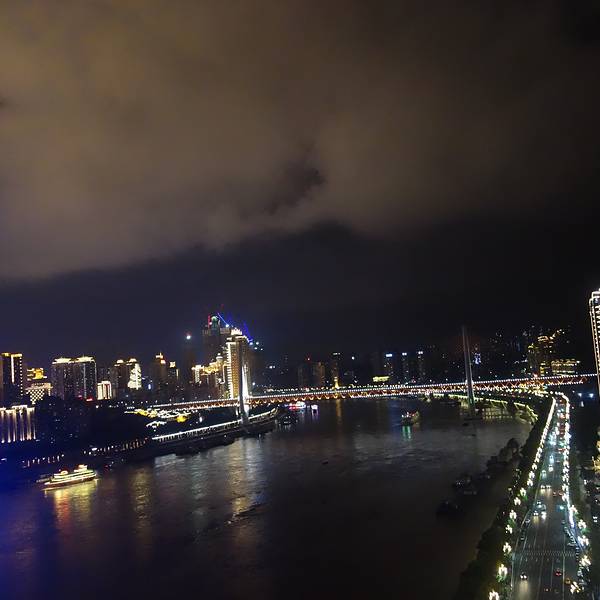 天色再暗下来,天空就变成了夜空,染上了无边的黑色。这个时候适合慢慢沿着天色再暗下来,天空就变成了夜空,染上了无边的黑色。这个时候适合慢慢沿着千厮门嘉陵江大桥走,逐渐走到桥上面。7月中旬的重庆还是非常热的,然而在桥上的时候,能感受到嘉陵江上的风触摸到自己面颊,心情也会忽然的开朗。天色黑下来以后,洪崖洞也变得灯火通明,倒映在嘉陵江上,形成壮观的波纹。大桥两侧,晚上的时候会有很多游客和当地人在散步。趴在栏杆上可以静静的观赏整个重庆的夜景风貌,迎面就是舒服的晚风,整个人感到非常的惬意。在桥上拍摄风景也是非常不错的体验,不过千万小心手机不要掉入了嘉陵江。夜色下,重庆市区繁华绚丽的夜景尽收眼底。深色的嘉陵江倒映着重庆璀璨夺目的夜景,形成了非常壮观的一幕。在这个时候,真的非常能感受到重庆城市的飞速发展。沿着千厮门嘉陵江大桥继续往前走几步,就可以看到壮观的洪崖洞了。夜晚的洪崖洞真的非常像千与千寻中汤屋的景观,在桥上看着洪崖洞,有一瞬间似乎感觉自己来到了千与千寻的世界。在大桥看洪崖洞,真的非常壮美,灯火通明,照亮了重庆夜空。洪崖洞地下密密麻麻全是游客和汽车,都在非常缓慢的移动着。再往前走,就到了洪崖洞顶楼的平台,那边真的人山人海,大家排队进入洪崖洞景区,附近也有马路和车来车位,如果不是刚刚从桥上看到洪崖洞的11楼景观,只会感觉自己已经走到了1楼。那个时候真的有种非常奇妙的感觉,也终于非常深刻的理解了重庆的3D城市。然而很不幸运,走到了洪崖洞的时候,相机提前没电了,没法很好的记录洪崖洞的风景。
