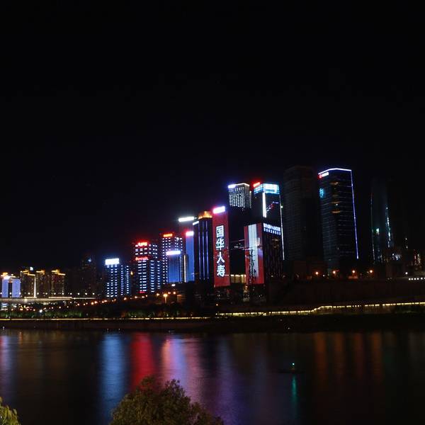 - 嘉陵江倒映着重庆灯光璀璨的夜景,非常好看。晚上的重庆城市风光。在大桥上拍摄重庆夜景金骆驼