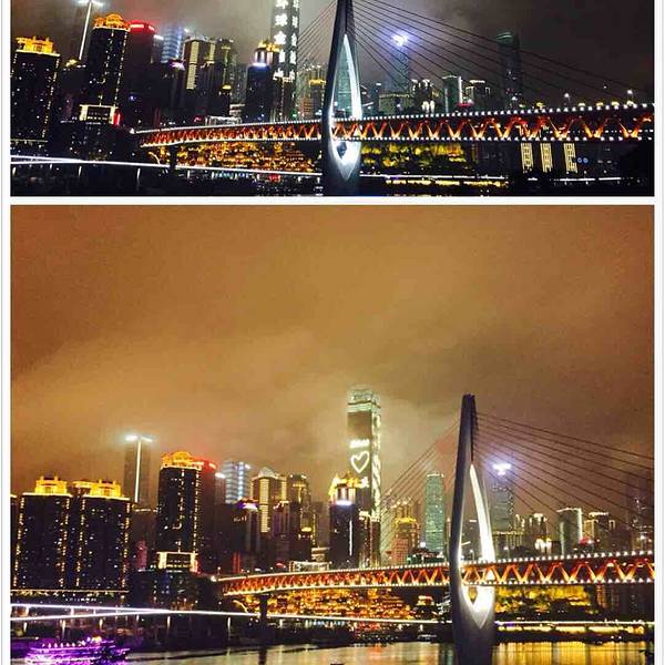 千厮门大桥不出所料,也要排队才能上桥,不过比洪崖洞人还是少了一些。重庆 有很多有特点的建筑, 比如 这个歪扭扭的楼(不是暴力后期导致的,是本来就是歪的)好在千厮门大桥的人行道没有那么宽,不会有洪崖洞那么多推攘而过的路人,最终,还是拍到几张夜景。告别“江上之清风,与山间之明月”, 告别摩肩接踵的洪崖洞,千厮门, 我们返回酒店,筹划明天的行程该起多早,才能赶在绝大多数人之前。