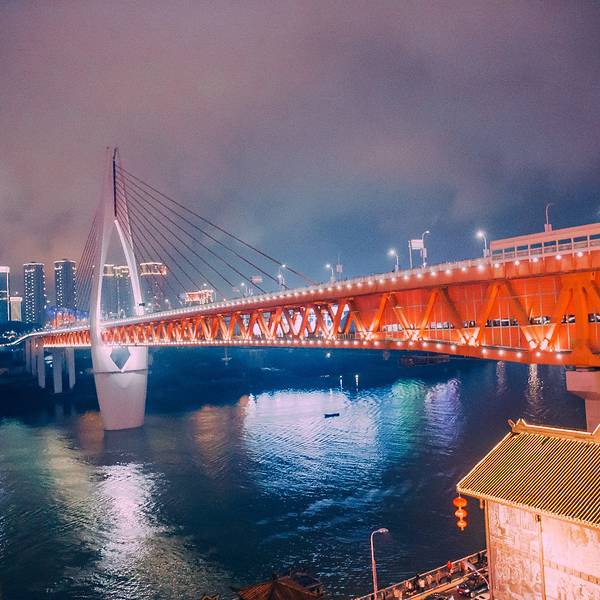 晚上的...重庆千厮门嘉陵江大桥,连接了重庆市渝中区与江北区,横跨了嘉陵江,位于洪崖洞旁边,可以直接从大桥走到洪崖洞的楼顶,在嘉陵江大桥上拍摄洪崖洞也是绝佳的位置,建议可以把大桥和洪崖洞连起来一起游玩。