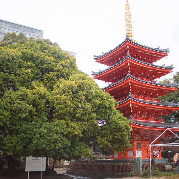东长寺位于福冈的博多区,是真言宗九州教团的主寺院,山号为南岳山,正尊总为弘法大师,是福冈市指定的历史遗迹。 据传,大同元年(806年)弘法大师从唐朝修业结束后归国后修建了东长寺,为了祈愿密教向东广泛传播而建。作为弘法大师创建的寺庙是日本比较古老的,当初地处海边,黑田忠之把它迁移到现在的地方。寺内的墓地里奉有黑田忠之,第三代藩主黑田光之,第八代藩主黑田治高,成为黑田家的家庙。每到正月28日的“初不动”、2月的“节分会”和3月的“正御影供”,会有很多人前来求拜。 寺院珍藏的千手观音菩萨是平安时代的作品,由一棵罗汉松雕刻而成,虽然仅有高达87厘米的,却充满历史的厚重感,明治时代就被指定为国宝。 六角堂 由轮藏和覆屋构成的六角堂无论从形态还是功能来看都是出类拔萃的佛教大殿,是福冈市指定的建筑物。天保13年(1842年)居住于博多的丰后屋荣藏(万岁楼袖彦),从名古屋以西的商人那里募集资金,招募名古屋的堂宫大匠•伊藤平左卫门建造布施的。中间的六角形的厨门上,还保存有当时文人墨客所描绘的书画。 福冈大佛 昭和63年(1988年)开始雕刻,历经4年岁月终于完工。高10.8米,重30吨。16.1米高的光背上雕刻有7尊或13尊佛像,后面壁上还供奉有5000尊小佛像。在其旁即是宝藏展览馆。