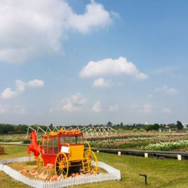 蔚然花海位于成都市龙泉驿区旁,一期占地1200亩,是成都近郊的一年生花卉观赏基地,为4A景区,成都市音乐产业基地、中国青少年国际营地。景区以观花、休闲体验、文化活动为特色,配套服务多、业态丰富。 景区分为前中后区,前区主要为草坪活动区域,中区为赏花、儿童游乐区域,后区为大面积观花、餐饮、民宿集中区域。 赏千亩花海:四季花卉不同,不同时间到花海可观赏到郁金香、马鞭草、洋彩雀、洋牡丹、格桑花、虞美人、紫罗兰、大花飞燕草、矢车菊、金盏菊、蜀葵、向日葵、香雪兰、羽扇豆、美丽月见草、大马士革玫瑰、欧洲月季、桃花、黄花风铃木等。 湿地近水:景区有未央湖、花语湖、含柳湿地、落英湿地、迷你荷塘等湿地静水区域,可赏芦苇、水竹,观鸳鸯、天鹅、野鸭、白鹤等野禽戏水。可乘坐直升机、小火车、观光车,驾驶萝卜车、自行车赏花,还可步行畅游于花海中,体验不同的赏花感受。 休闲运动:景区5公里的超长闭环水泥路面,没有车流干扰、空旷平坦,可供游客散步、跑步,还能骑自行车、萝卜车等,还有游玩项目重走长征路等。50亩的大草坪可以放风筝、玩真人CS、做各种拓展活动。 儿童游乐设施:景区配备有丰富的儿童游玩项目,小火车、疯狂米老鼠、旋转木马、自控飞机、碰碰车、升降塔、海盗船、太空漫步等分散在园区不同区域,供游客体验。 文化体验:与清华大学艺术学院、独立音乐公社、西部陶艺基地等院校、团体开展深入合作开展文化活动,设有音乐博览馆、音乐体验馆、陶艺馆、元素山丘民宿、花坡闲寓民宿等。常年开展形态丰富的音乐文化艺术活动,仙人掌音乐节、春浪音乐节、日落春浪电音节、花妖音乐节、mini马拉松等。 野餐露营:景区有良好的生态环境,多区域设置主题野餐区、帐篷露营基地、房车营地等供大家野餐露营。不同时节在花海还能体验挖野菜、钓龙虾、捡田螺的乐趣,感受生活的美好与本真。 服务配套:景区设有百合原多功能厅、蓝色一方、书茶集、元素山丘、花坡闲寓、中间屋、网红泡泡屋、游客中心等休闲区域,为游客提供多种形态又便捷的各项服务,多区域提供花海特色餐饮。