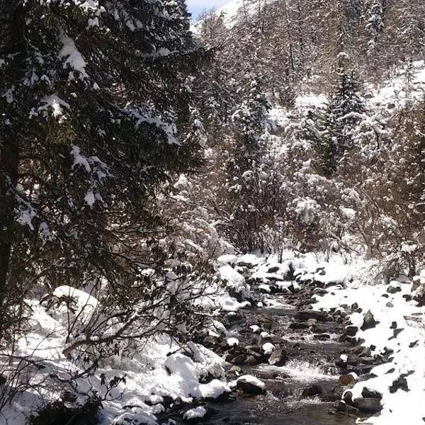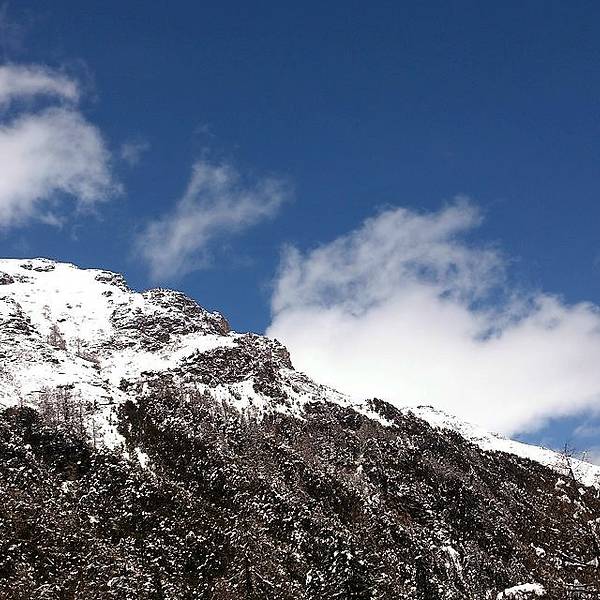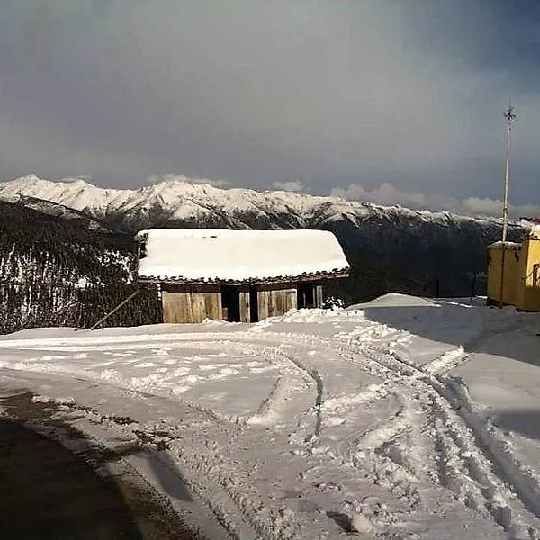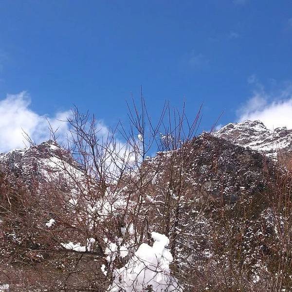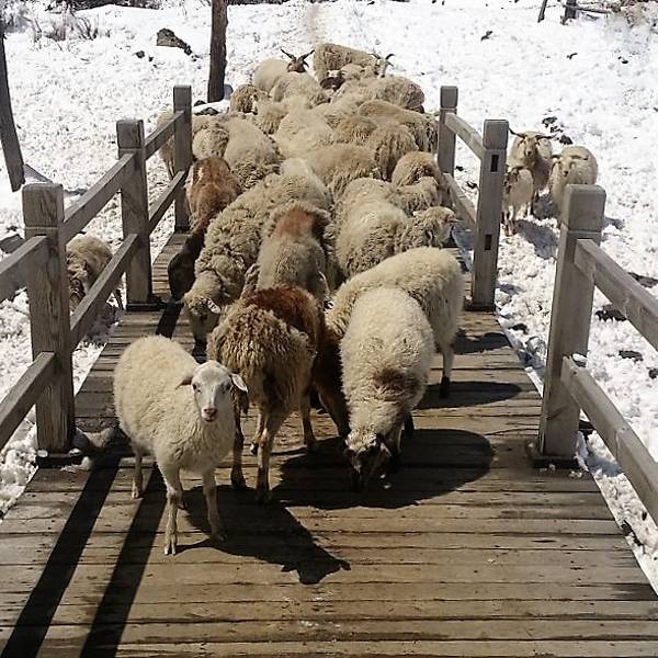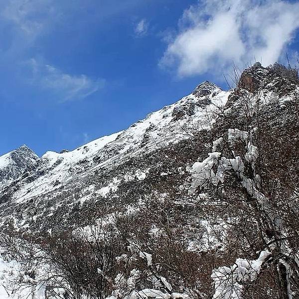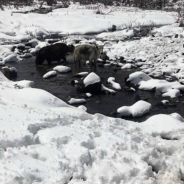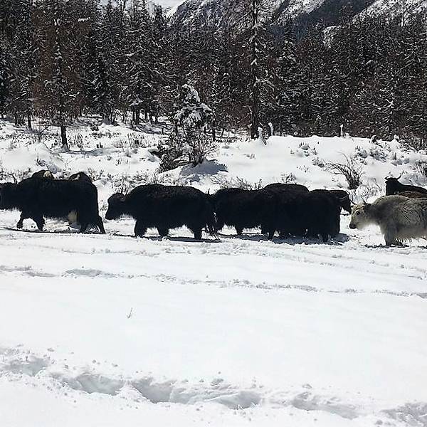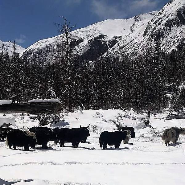 吃完早饭集体出发前行,在距离村子不远处就看到雪山的入口处写着“玛嘉沟”三个字的门牌,由于寒冷的空气使得大家都精神抖擞的,不过爬山半个小时后你就会很暖和啦。我们大好团队旅行,由于体力和步行的快慢不一致,导致被分成了几队,这也是后面没有到达“月亮湖”景点的原因。途中大家有说有笑,蓝蓝的天空横穿整个头顶,白白的雪儿铺满前行的道路,树枝上堆积的雪在阳光下亮的耀眼,半山腰还有潺潺的溪水在流畅,远方的山远方的雪,吸引着我们不断前进的脚步。在接近下午1点钟的时候我们同行的伙伴准备停下来补充食物,刚好也可以减轻背包的重量,随处找个可以坐下来的地方就地而歇,没有地方可坐的伙伴就站着吃自带的食物。吃完继续前行,我们是属于中间的队伍,在到达积雪更深的地方,领队让我们放慢前行脚步,等待走在最后的伙伴们,这时的积雪已经深到膝盖甚至部分地方漫过膝盖,前面的伙伴们已经给我们开了路,走到视野广阔的地方时,我们看到的牧民用木头搭建的牛棚,牛羊群在木栈道上休息,我想这些是不怕寒冷的牛羊,因为我看到还有牛羊站在冰冷的水中饮水,我们在这里堆雪人玩雪仗,越来越多的伙伴抵达这儿,当领队带着最后一波伙伴到达时,此时已经三点多,牧民告诉我们如果我们去“月亮湖”就来不及再天黑前赶回到山下,由于很多伙伴们已经耗费了大量体力,所以我们不得不放弃“月亮湖”这片神秘的净土。抵达到山脚下接近六点钟了,居住在藏家的藏民已经帮我们升起了篝火,篝火上方的木架上穿挂着超级大的鸡,赶紧回去把灌满了污水的鞋子脱下来清洗,再回房间做了个面膜涂了芦荟胶,然后跑到篝火边取暖,隔壁小卖铺的棉拖卖的一干二净的,没有多备鞋子的同伴都围在篝火旁边边烤鞋子边取暖。