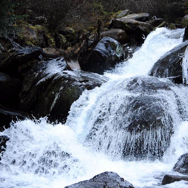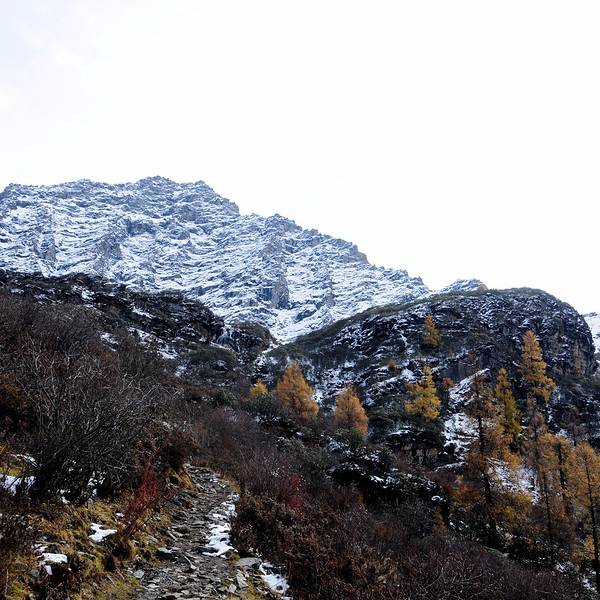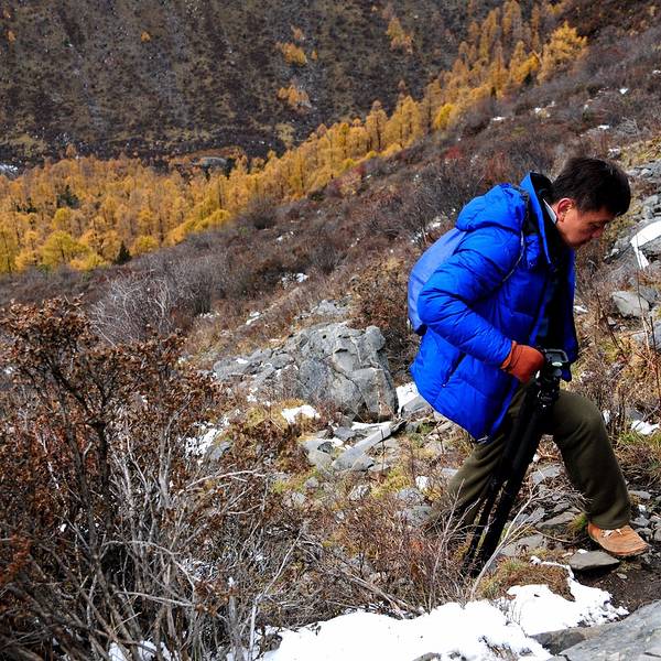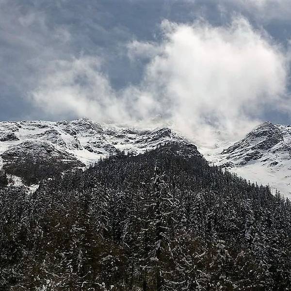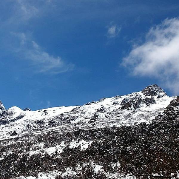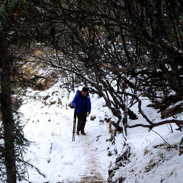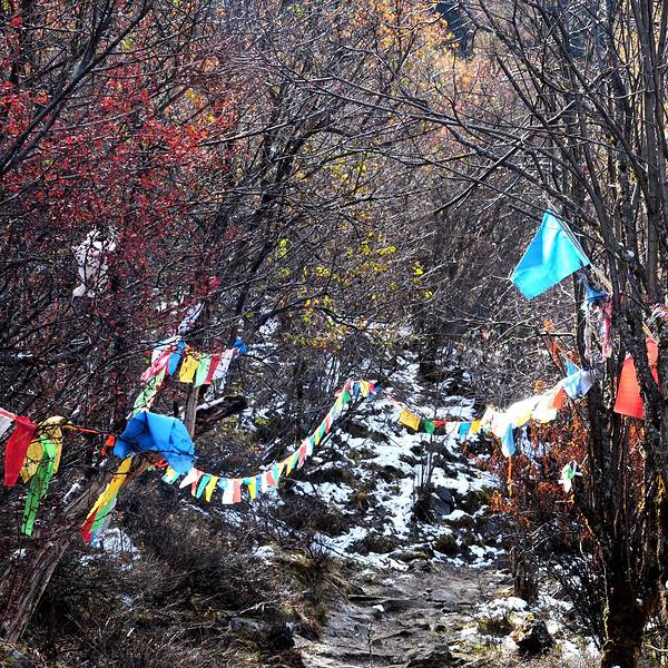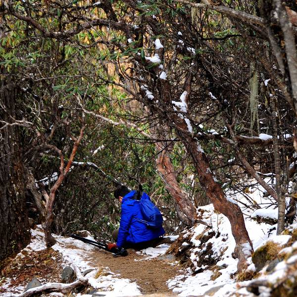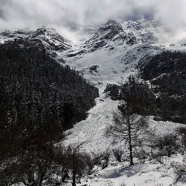我们也决定上去,虽说知道月亮湖海拔4259米,我们刚翻越过川藏、青藏线上那么多高山,心里觉得可以接受,殊不知....过了这座简易的木桥后在山坡上只能跟着经幡走,乱石形成的路很容易让你迷路。一路爬上来,觉得根本不是预想的那么回事儿。泥泞的道路被霜和冰冻过之后,很坚硬很滑,尤其在其中的几段陡坡,必须手脚并用,就是这样还特别容易滑倒,这不,相机的三脚架也被当做拐杖使了走在原始密林里一味地往上爬,很是枯燥,只能爬一小段就歇上一会儿,拍点风景给自己打气,还要不时的鼓励爬在后面的“副团长”等你见到这块巨石就快“冲刺”到顶了,当然,人也累到极点了山顶飘起了雪花,乌云也在涌动,下面照片上的雪山只一会儿就被浓雾遮住了,只能听见小瀑布(其实就是一个流水缺口)的声音接近山顶的那一段,雪越下越大,垭口的山体已被雾气遮住,山下依稀还有点能见度回看山顶,月亮湖就在眼前,在高海拔地区爬山,只能走上十几米就得歇上两分钟喘口气……感觉老也走不拢呢……从山上下来的游客告诫我们说切勿按照石头小路走瀑布的右边,说是很滑又没栏杆。那就应该走左边咯,可路在哪儿呢??突见山顶有一群羊下来,感觉那里似乎有条便道。村民自建的简易小路在海拔4259米的飘雪的山顶,非常滑,山顶小瀑布右端那一段已被冰雪冻住,还没有栏杆......走在前面的一对情侣刚走了一小段就折返回来,说那姑娘差点摔倒,右面可是悬崖啊,吓得那姑娘腿直哆嗦只能在乱石里自己找路,山顶的坡度估计有70度吧,所以你得踩稳了一只脚感觉不滑才能去挪另一只脚 展开