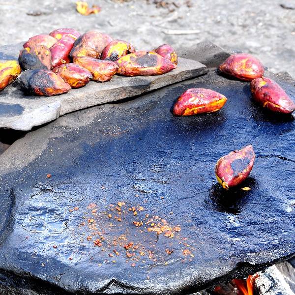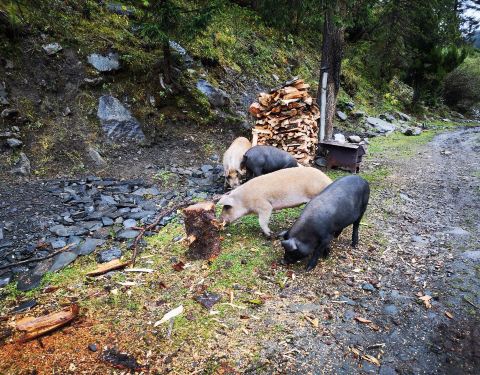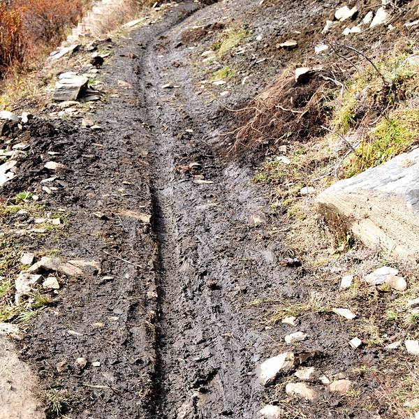 和栈道合拢的地方还在修路,这样的车辙还算浅的,很深的那段没法下车拍照也不敢下车,路太窄太泥泞了早上一点点太阳光线加上并不亮眼的景色,小失望,只能呵呵了......只能拍些小景玩下车后往前走一段就是一个牧场,水基本干涸,狭长斜向的走势不太开阔。路上遇到一个刚从月亮湖下来的游客,说他花了一小时四十分钟上到山顶,还鼓励我们说这会儿天气晴了应该好看了牧场的角落有个冒着炊烟的木屋就是露营的地方,依山傍水位置不错。昨天在沟口听说露营和客栈收费是相同的,不过我这身板儿和这个天气是不敢尝试的沿着栈道走到草坪上,一位买烧烤的大姐用石板当“锅”卖着烤红薯,很小的一个要5元,出于好奇买了一个,基本是凉的,不过这海拔、这天气、是可以理解的,对吧